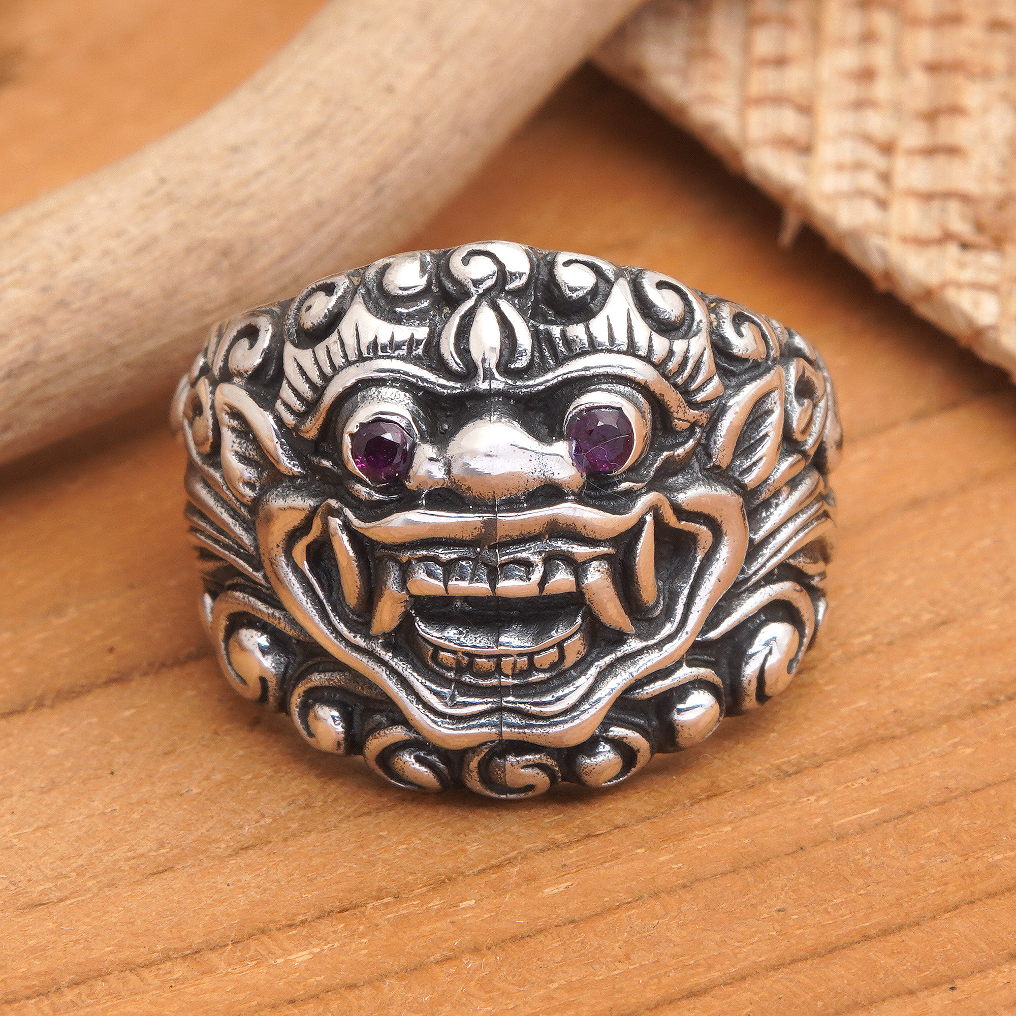 Inspired by the ancient legends of the Balinese region, artisan Gede Agus Mahardika creates a magnificent sterling silver cocktail ring whose details tell a fantastic story. Made in a polished finish, the accessory takes the shape of the famous Kala Rau demon, whose purple cubic zirconia eyes illustrate the exact moment this ferocious spirit set his gaze upon heaven's beauty, as told in the Adi Parva saga.