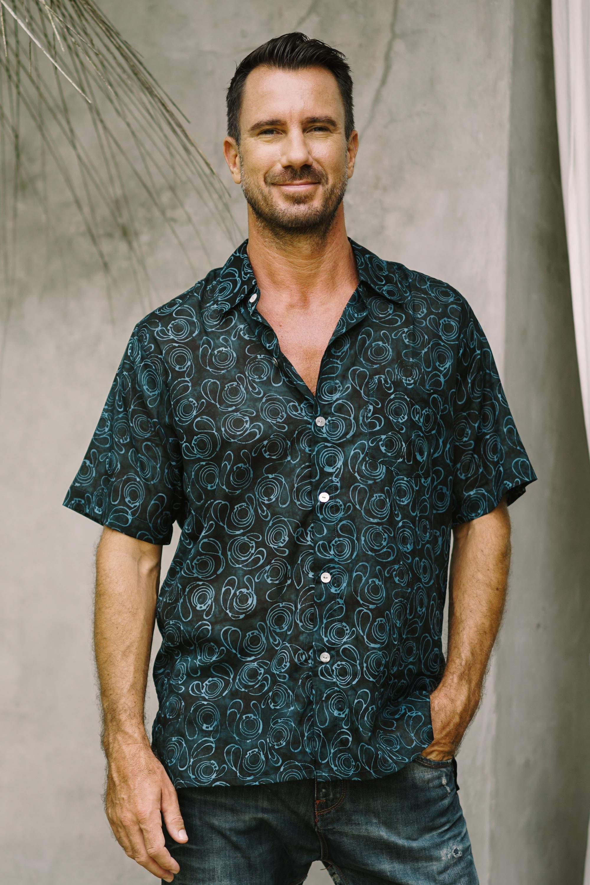 Reach for this trusty classic from Bali's Ketut Suwitra when you need something comfortable and stylish. Crafted from 100% cotton, the handsome shirt features short sleeves, a collared neckline, and a row of coconut shell buttons. The artisan uses a soda ash dyeing technique that peeks through a hand-stamped spiral motif. Please note the soda ash dyeing technique yields varying color intensity on each handmade piece.