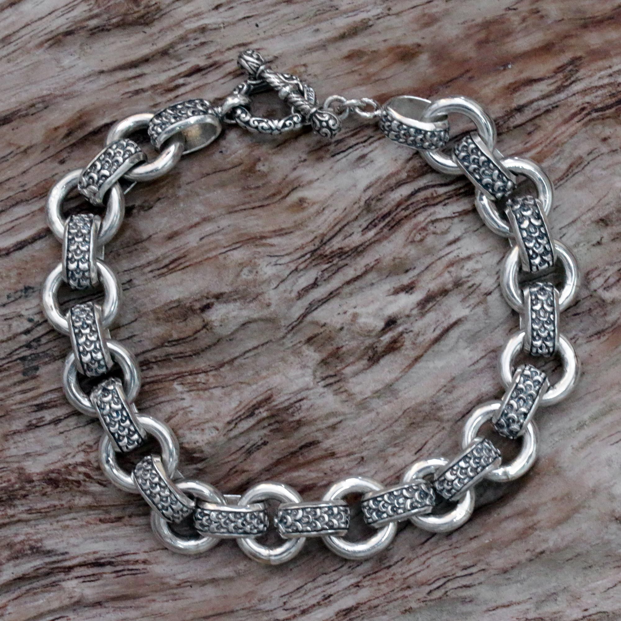Sterling silver rings with scale motifs adorn the length of this link bracelet, crafted by local Indonesian artisans. Presented by Wayan Asmana, the elegant bracelet features a detailed toggle clasp.
