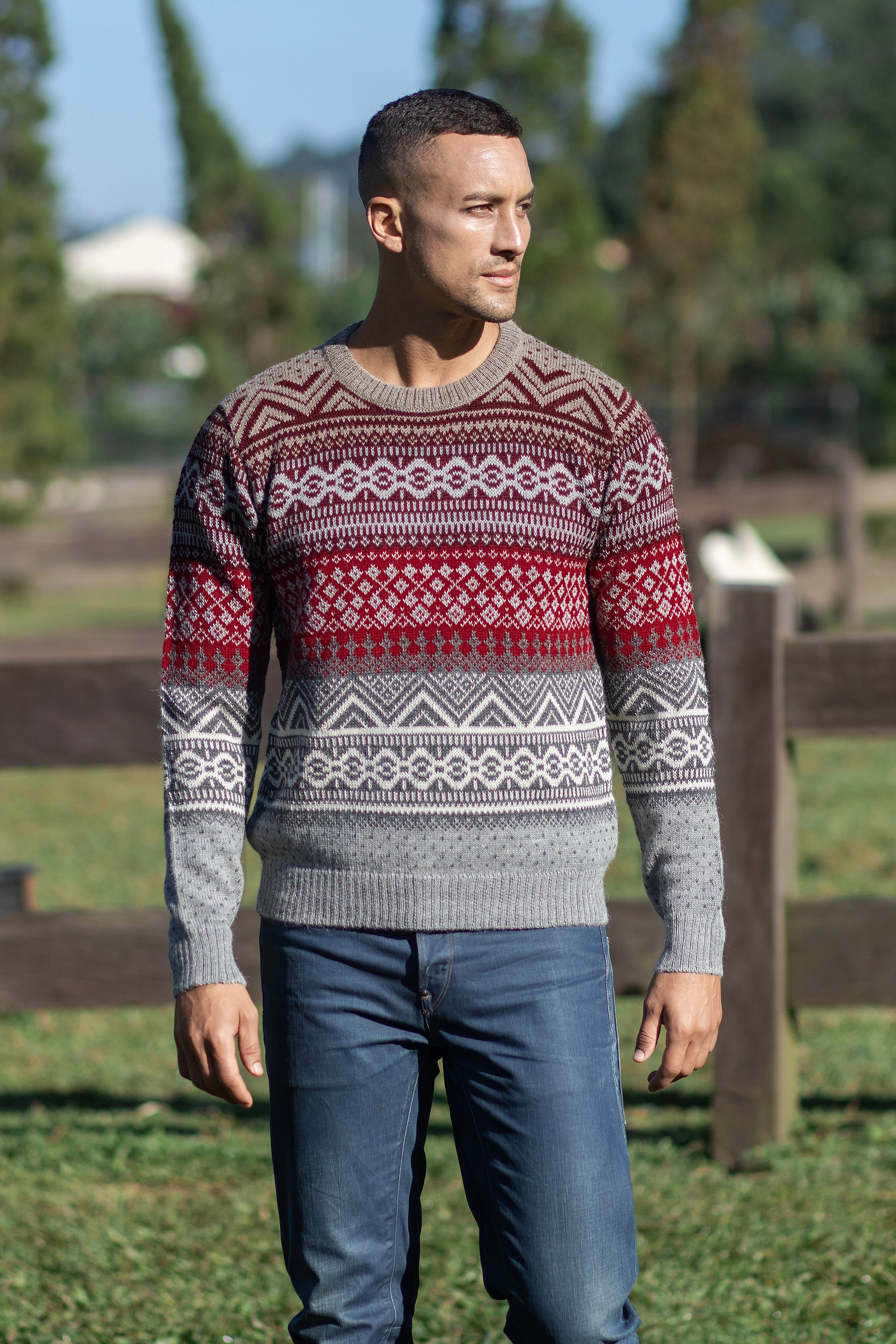 Look sharp this winter season with Fernando Cano's classic sweater with a tonal collage of geometric motifs and patterns in shades of red and grey. Knit of 100% alpaca fibers, the sweater features a rib knit crew neck, sleeve cuffs and hem.