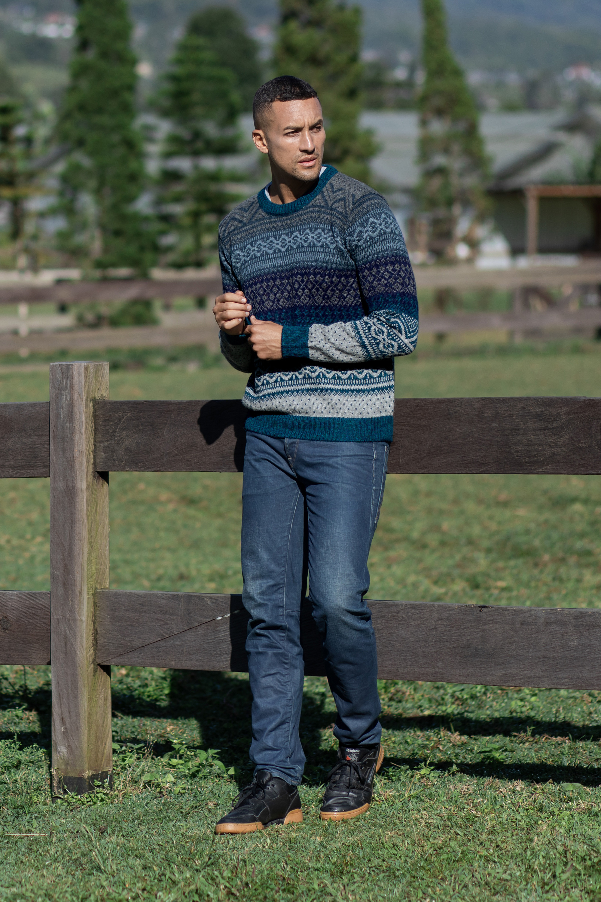 Look sharp this winter season with Fernando Cano's classic sweaters with a tonal collage of geometric motifs and patterns in teal, blue and grey. Knit of 100% alpaca fibers, the sweater features a rib knit crew neck, sleeve cuffs and hem.