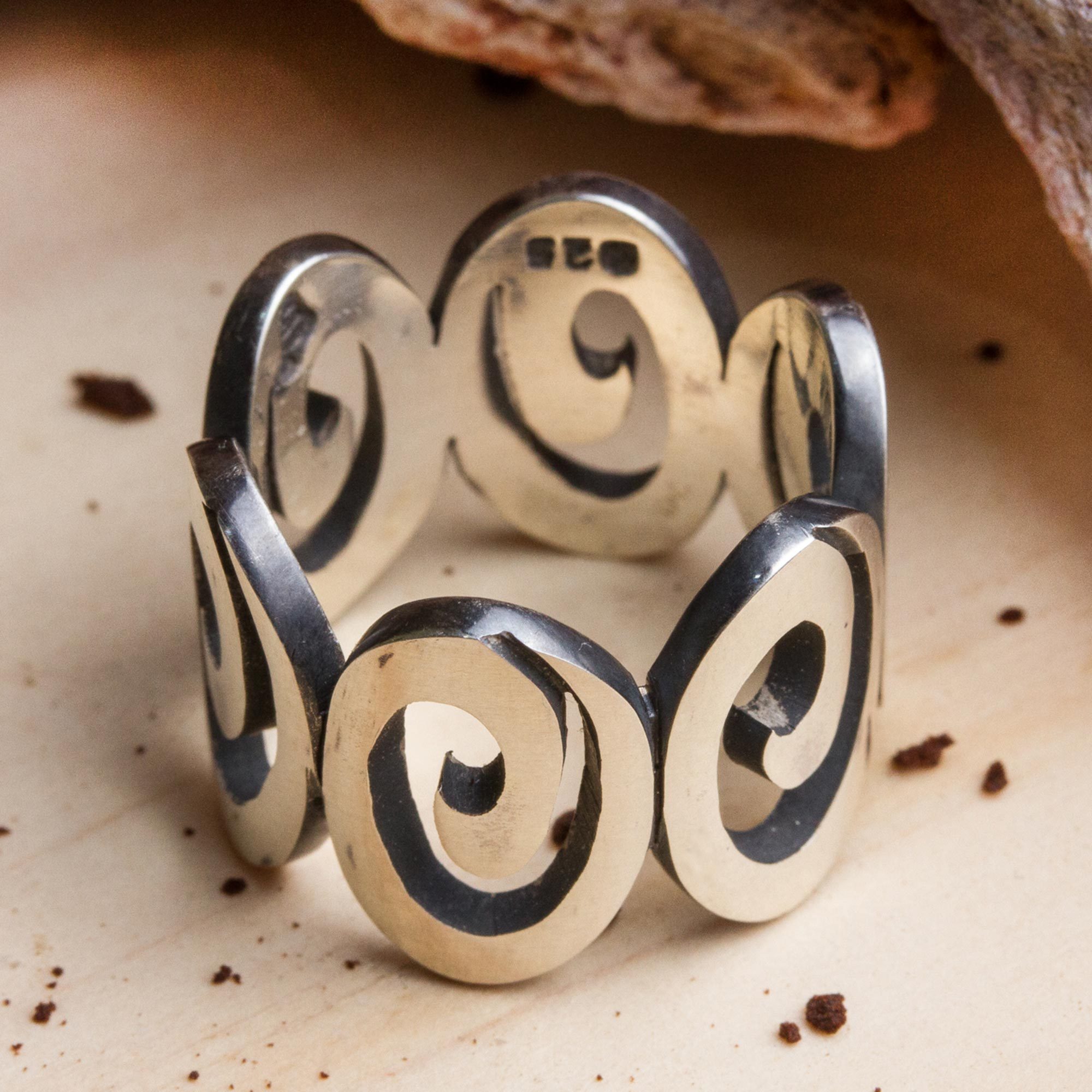 Designed for men, this Mexican band ring possesses a striking aesthetic. Shining spirals are crafted of sterling silver, accentuated with a combination of finishes. Mexican artisan Angel Ortiz designs the ring.