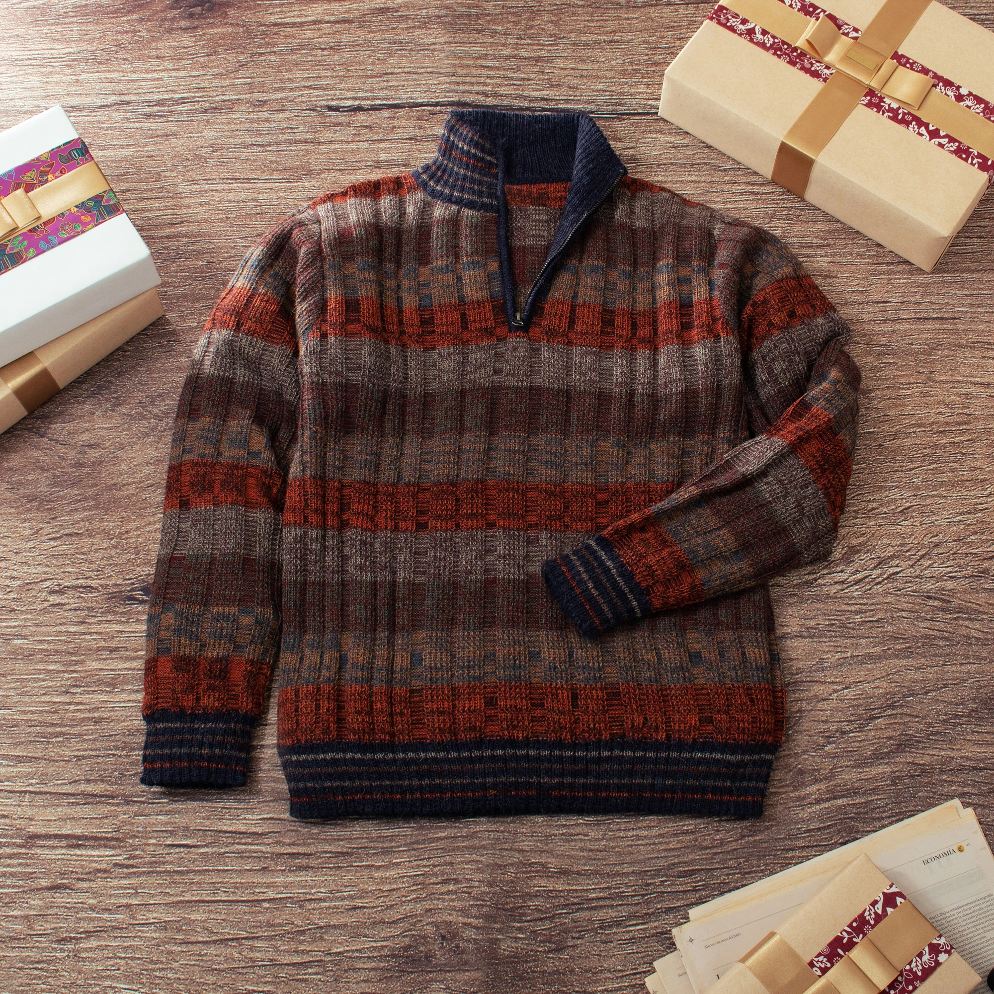 Nasturtium, indigo and sage hues mingle in this cozy men's sweater. Crafted by Fernando Cano, the 100% alpaca wool design features a zippered turtleneck for a dapper look. Loomed with traditional techniques, this long-sleeve garment also combines its striped pattern with a ribbed bottom hem and cuffs.
