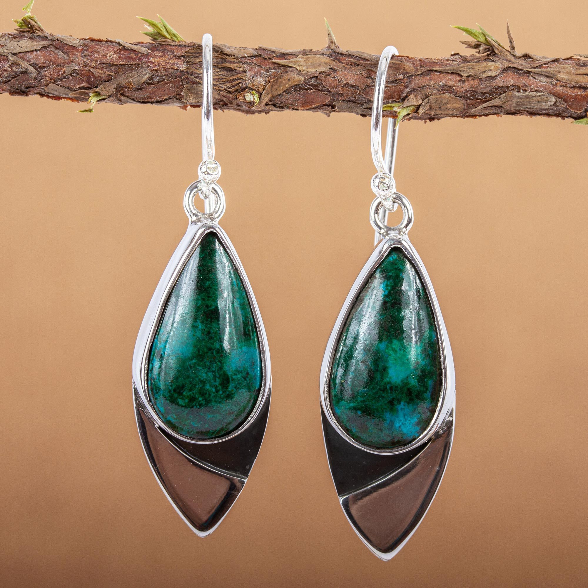 Embracing a teardrop of blue-green chrysocolla, polished silver is radiant. Alon Diller celebrates their contrast with these stunning handcrafted earrings.