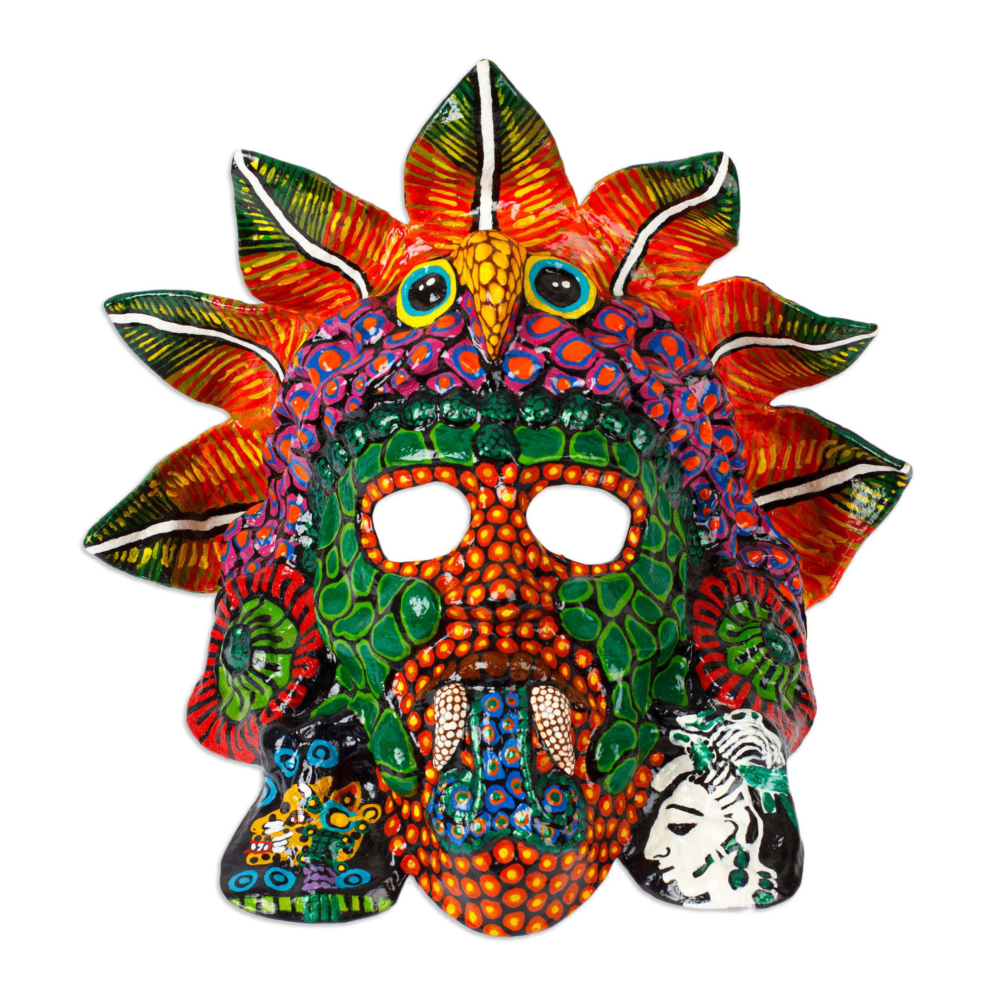 The spirit of Huehueteotl, the revered god of fire celebrated throughout several Mesoamerican cultures, is embodied in this imposing papier mache wall mask handcrafted by Mexican artisan Morneo that is sure to be the focal point of any space. Morneo's skillful strokes breathe life into the essence of this formidable god, draping the mask in a harmonious cacophony of lively hues that pirouette with vitality. Layers of protective lacquer enfold this artwork, infusing it with a luminous gleam that dazzles.