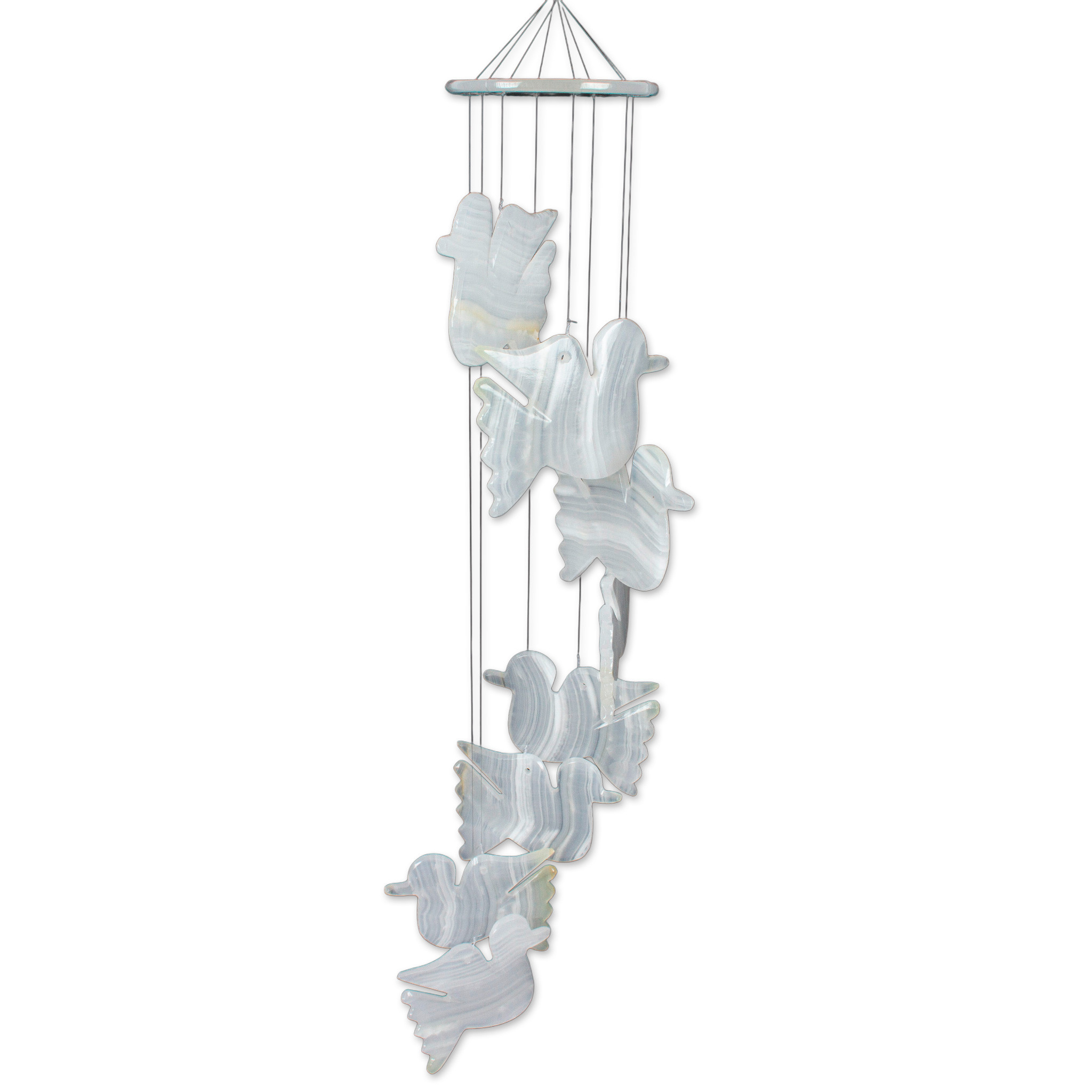 Fly to a world of heavenly silhouettes with the Sierra Family's mobile, carved by talented artisans. White onyx gives life to each of the dove-shaped figures that compose the design, each evoking serene sensations and forming a stunning illusion made with nylon strings.