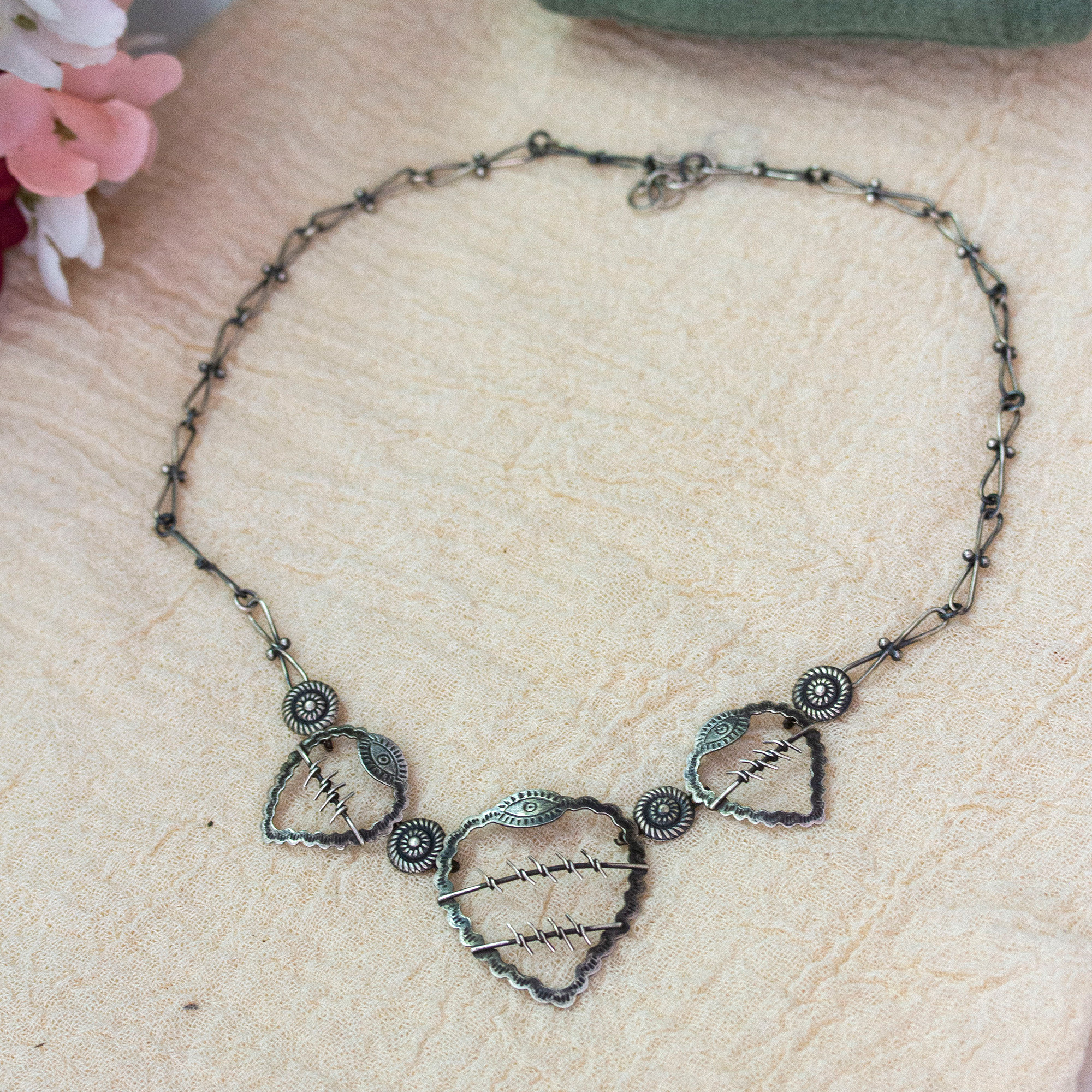 Crowned with protective eyes, three hearts center the dramatic design of this necklace. Maria Belen Nilson celebrates Mexican artistry through her original jewelry collections, creating a sterling silver necklace with classic details enhanced by a combination polished and oxidized finish.
