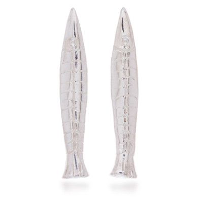 Walk through the marine runway of dazzling looks with Teresa Gonzalez's newest drop earrings, made of polished sterling silver. An exquisite silversmithing job allows each fish-shaped pendant to complete its length with whimsical scale details, taking your style to the heart of the sea.
