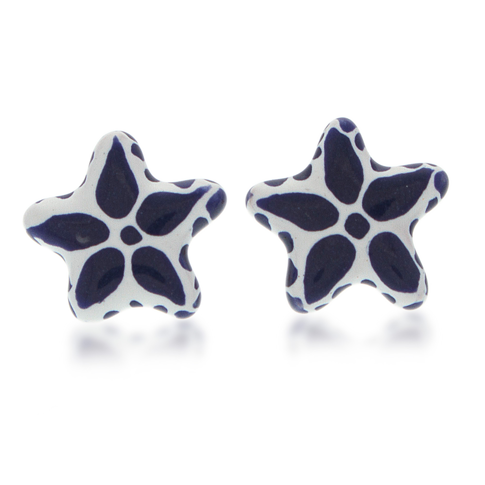 The highly prized Talavera pottery tradition inspires artisan Monica Vazquez to create this starry pair of button earrings. Made of ceramic and hand-painted with classic Mexican motifs in blue and white, these star-shaped pendants arrive with convenient 10k gold-plated posts.