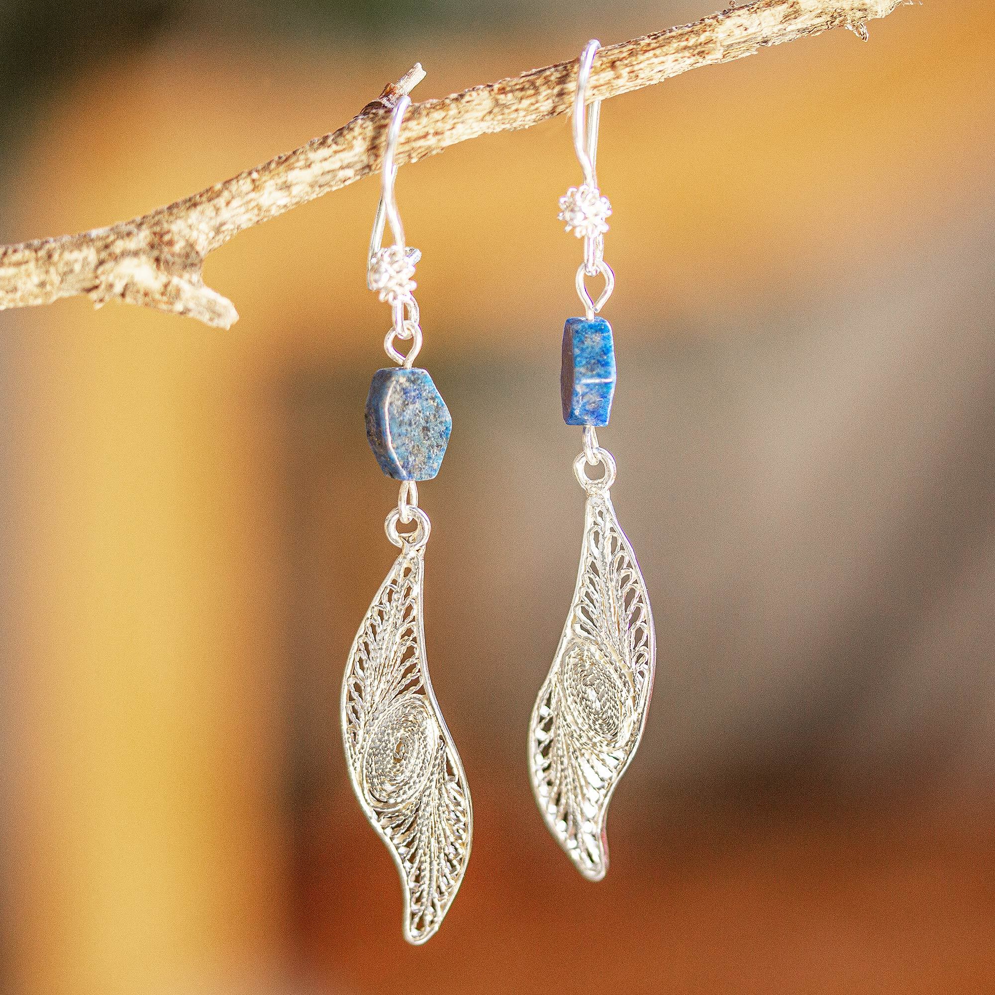 Mexican artisans use traditional filigree silversmithing techniques to bring Eva Souto's design to life in these sterling silver dangle earrings. Delicate leaves are anchored by hand-hewn geometric lapis lazuli chips, which provide weight and balance.
