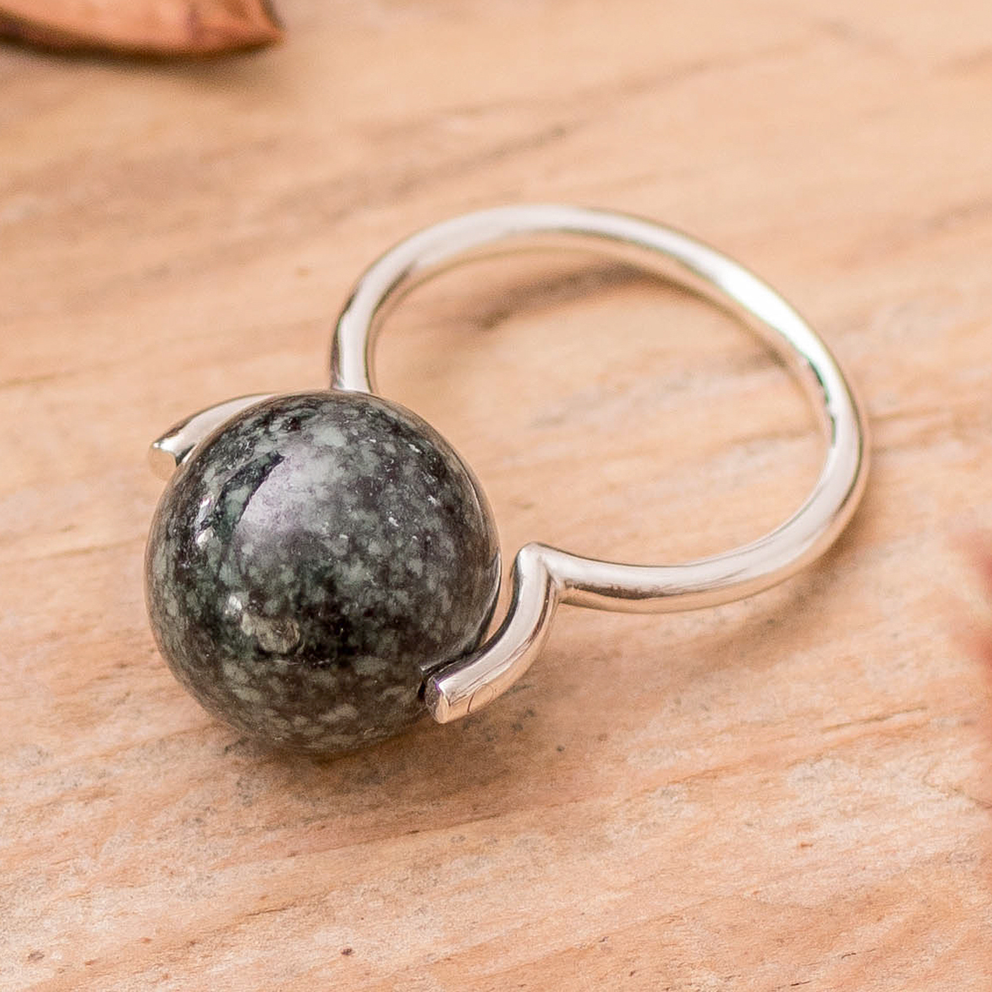 Minimalist Dark Green Jade Silver Ball Cocktail Ring, 'Contemporary Orb'
