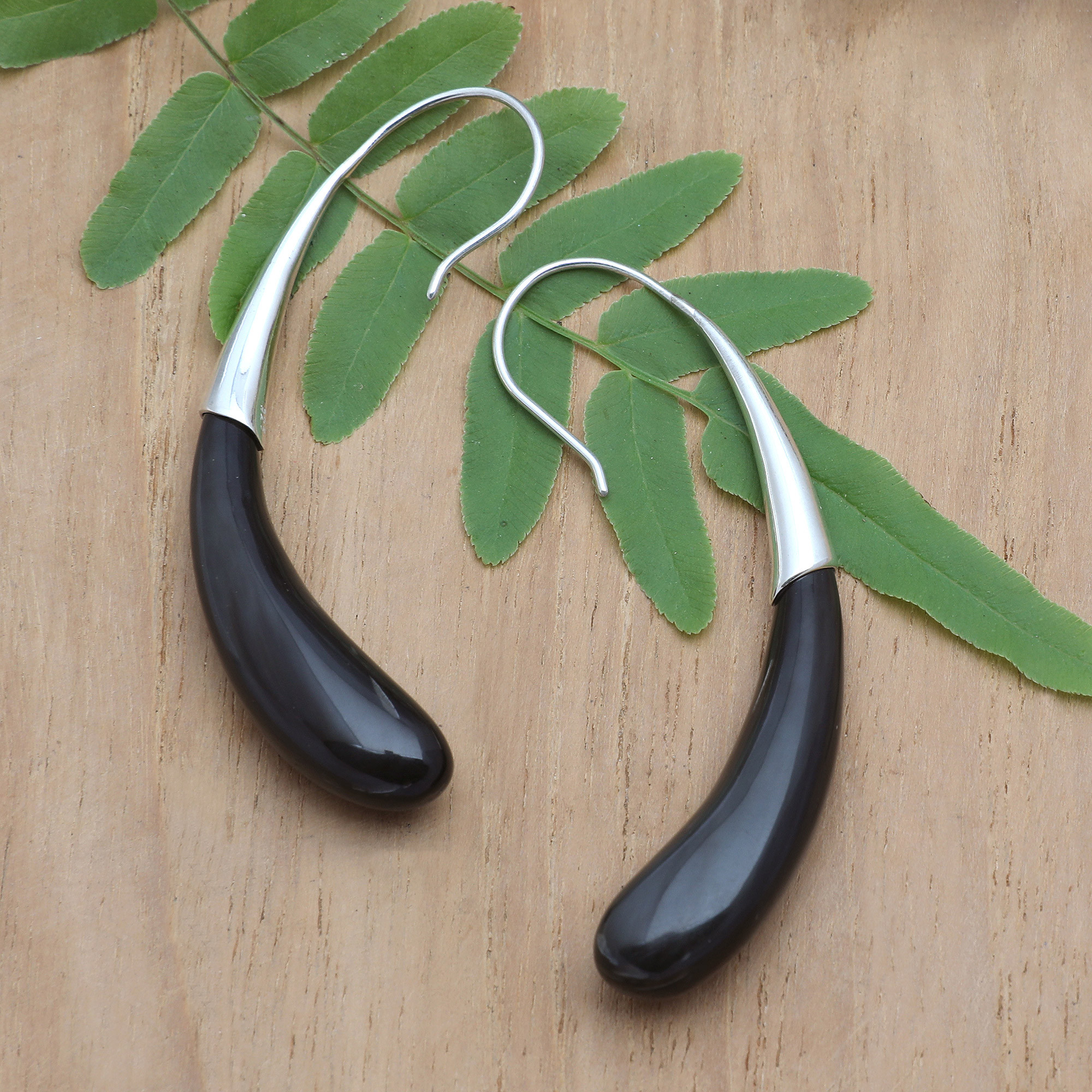 Balinese artisan Ayu Ary draws inspiration from modern and minimalist trends to craft these sublime sterling silver drop earrings, whose dark and metallic hues combine flawlessly to create a refined style. The pieces are polished for a shiny look, enriching the natural black light coming from the horn pendants.