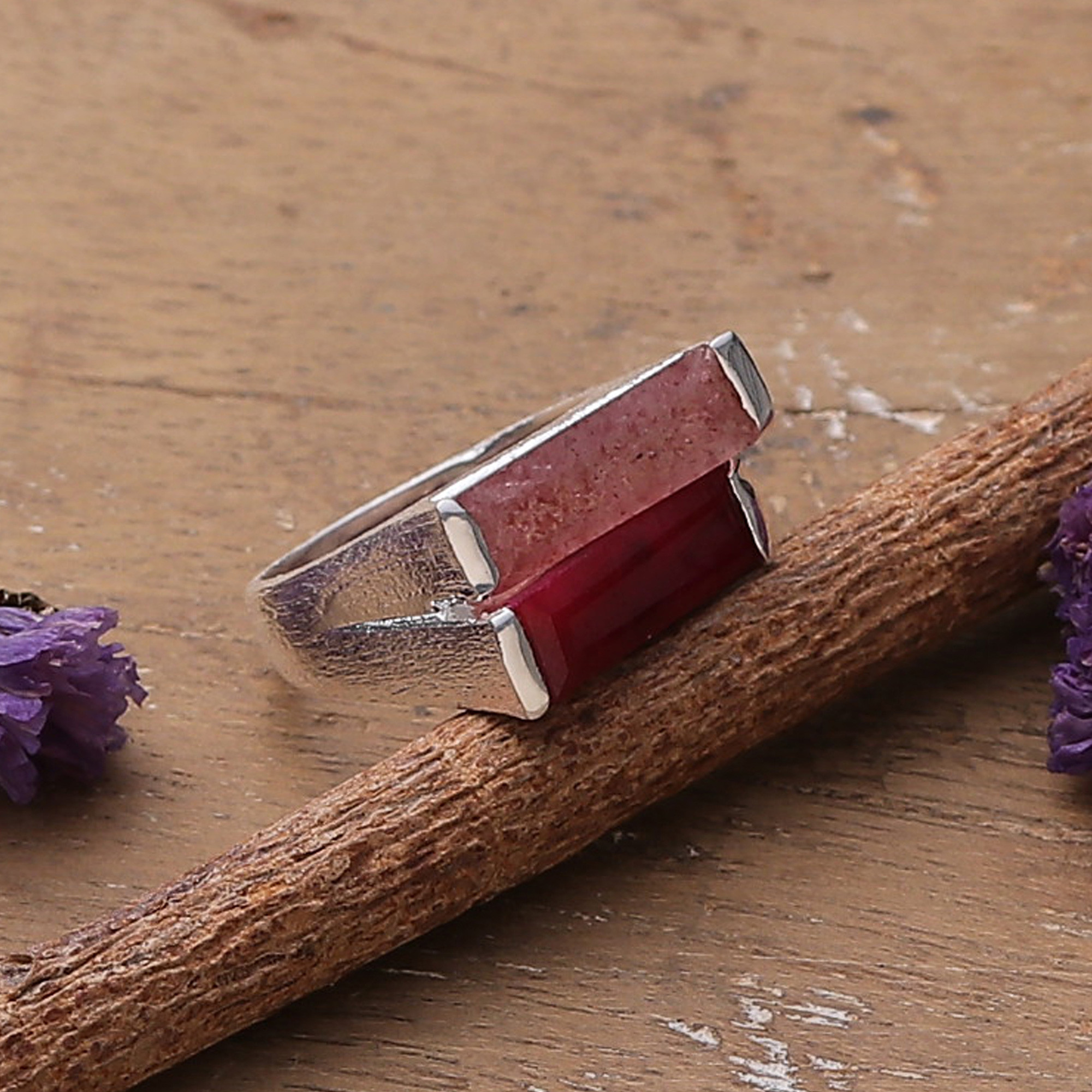 Explore the seductive colors living inside this cocktail ring by India's Neetu Barathi. Crafted following modern trends, the design transports you to a world in pink through gorgeous ruby and quartz jewels. Totaling over one carat, the gems rest on a sterling silver inlaid setting.