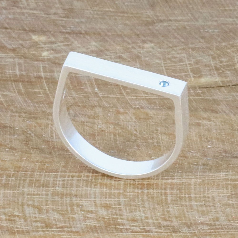This subtle ring has a minimalist appeal, with its slender band and brushed satin finish. The sterling silver ring, presented by Thailand's Sarote Lochotinunt, sports a petite faceted blue topaz gem at one wide. The simplicity of the design is eye-catching.