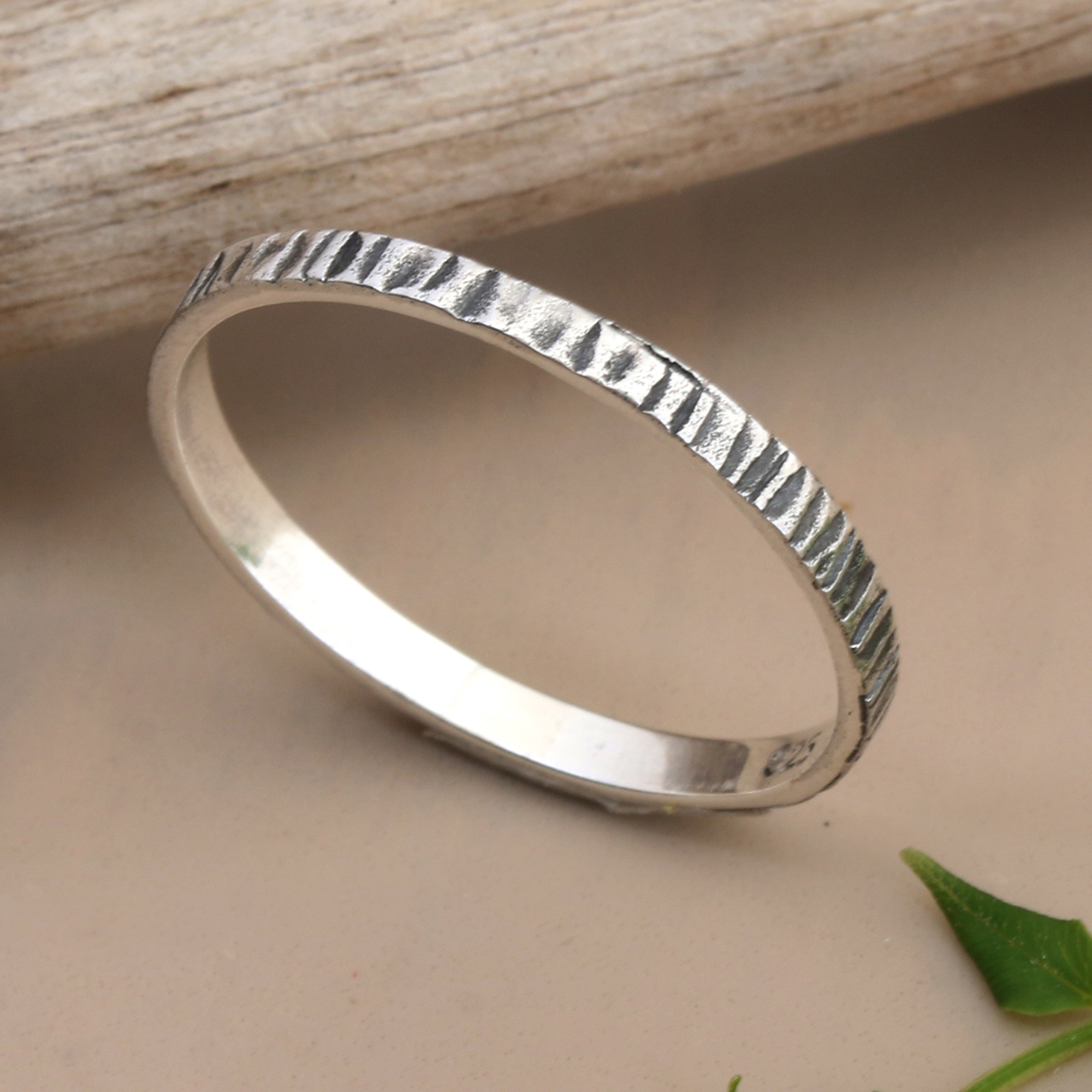Subtle texture transforms simple sophistication in this minimalist sterling silver band ring that proves less is always more. Designed by Bali's Silvani, the ring features a delicate ridged pattern along its surface that adds visual interest and tactile dimension while maintaining a clean, understated profile. The textured finish gives it an organic, slightly rustic quality that works beautifully for any gender and pairs effortlessly with everything from casual daily wear to more polished looks.