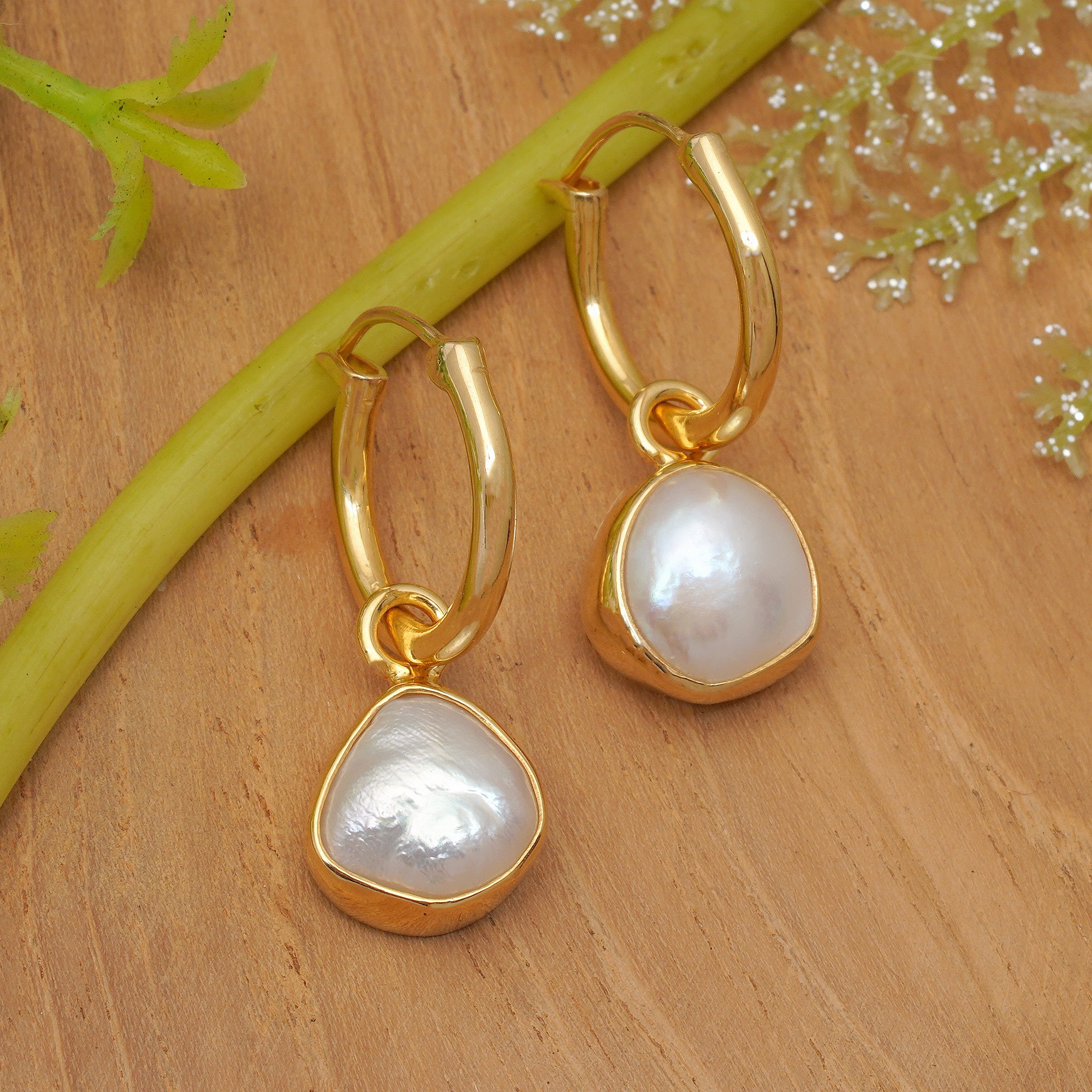 Give your classic hoops a fresh update with these modern earrings, featuring exquisite white baroque cultured pearls with a soft rose overtone. Elegantly encased in lustrous gold-plated settings, Balinese artisan Made Sri's stunning accessories add a contemporary touch and sophisticated flair to any look.