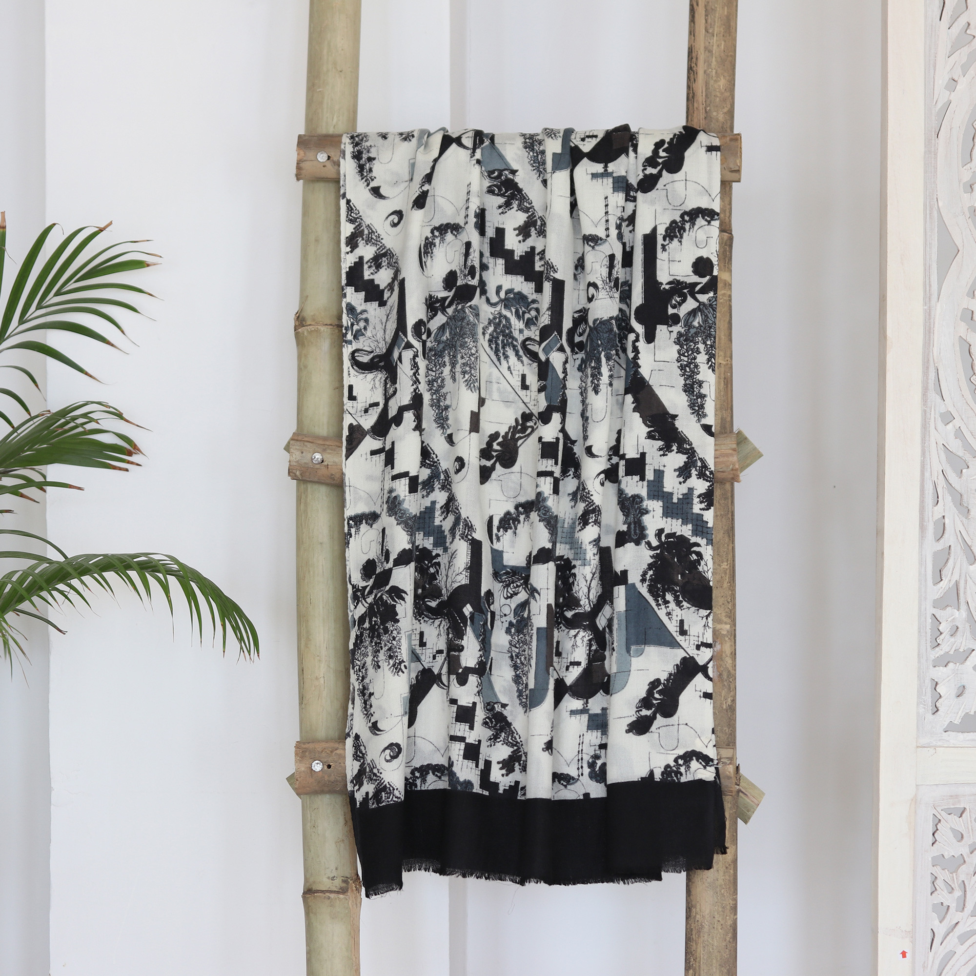 Wrap yourself in artistic elegance with this wool and silk blend shawl from India's Sajad, a modern canvas of abstract screen-printed patterns dancing across a crisp white background. Blending rich black, grey and brown hues, this lightweight and soft accessory offers the perfect layering piece with neatly trimmed ends, ready to transform any outfit with its sophisticated, painterly design.