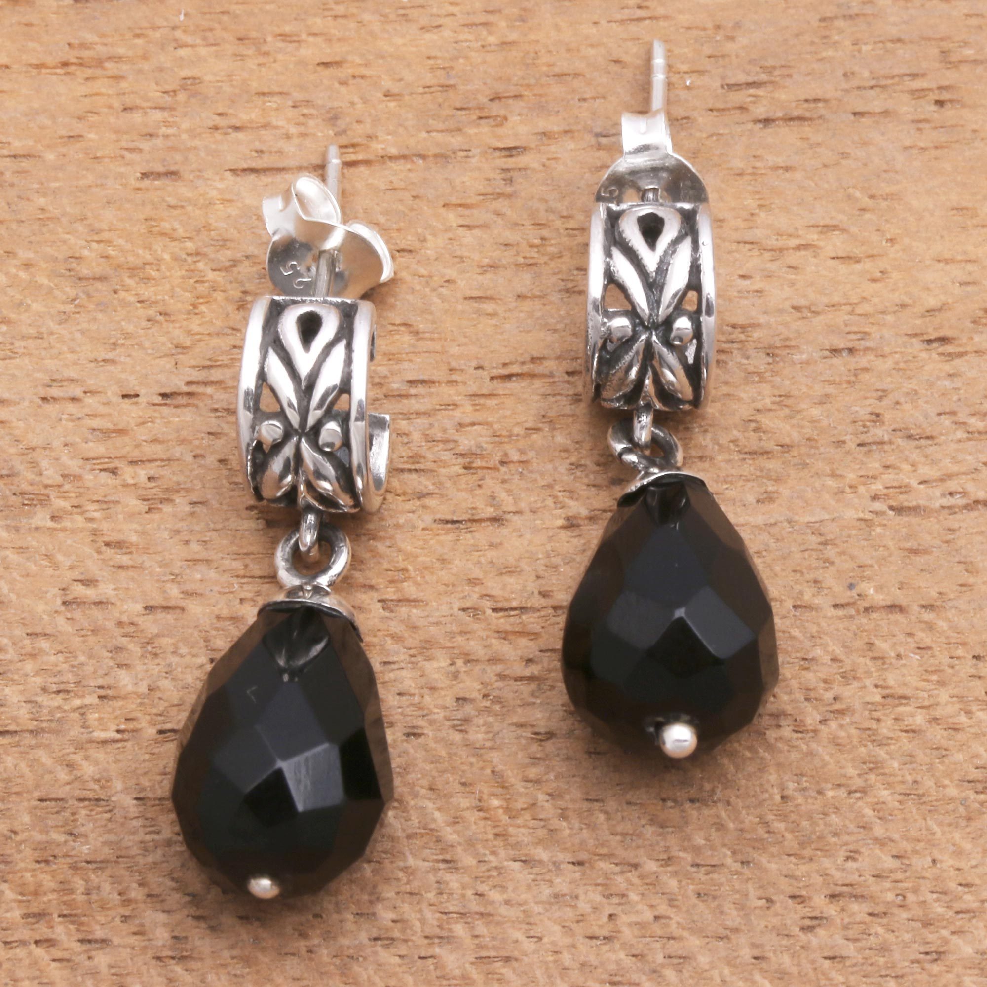 Modern Balinese Dangle Earrings with Faceted Black Onyx, 'Balinese Night'