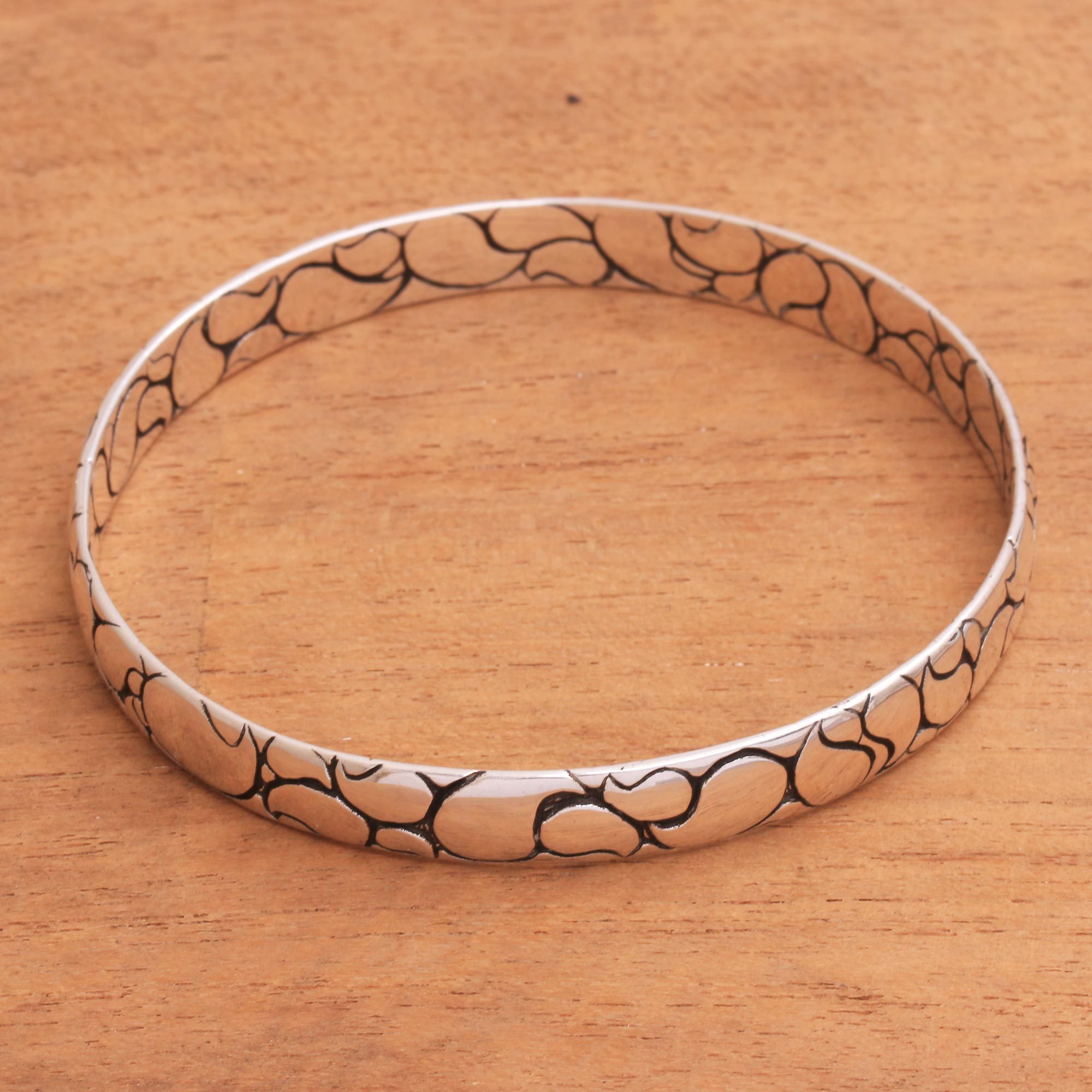 Employing a stylized paisley motif, Nyoman Ariawan handcrafts this stylish bangle. The bracelet is made from sterling silver, polished to a sheen. Stack this with similar bracelets for a boho-inspired look.