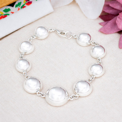 Luminous orbs of polished silver capture light like liquid mercury in this stunning modern bracelet that radiates pure elegance. Designed by Mexico's Oscar Figueroa Escorcia and crafted in gleaming Taxco silver, each dome-shaped pendant reflects your surroundings with mirror-like brilliance, creating a mesmerizing play of light and shadow with every gesture. The sculptural spheres are connected by delicate chain links that allow graceful movement, striking the perfect balance between substantial presence and refined sophistication. Ideal for those who appreciate contemporary design, this bracelet elevates any ensemble from everyday casual to evening glamour with effortless, radiant style.