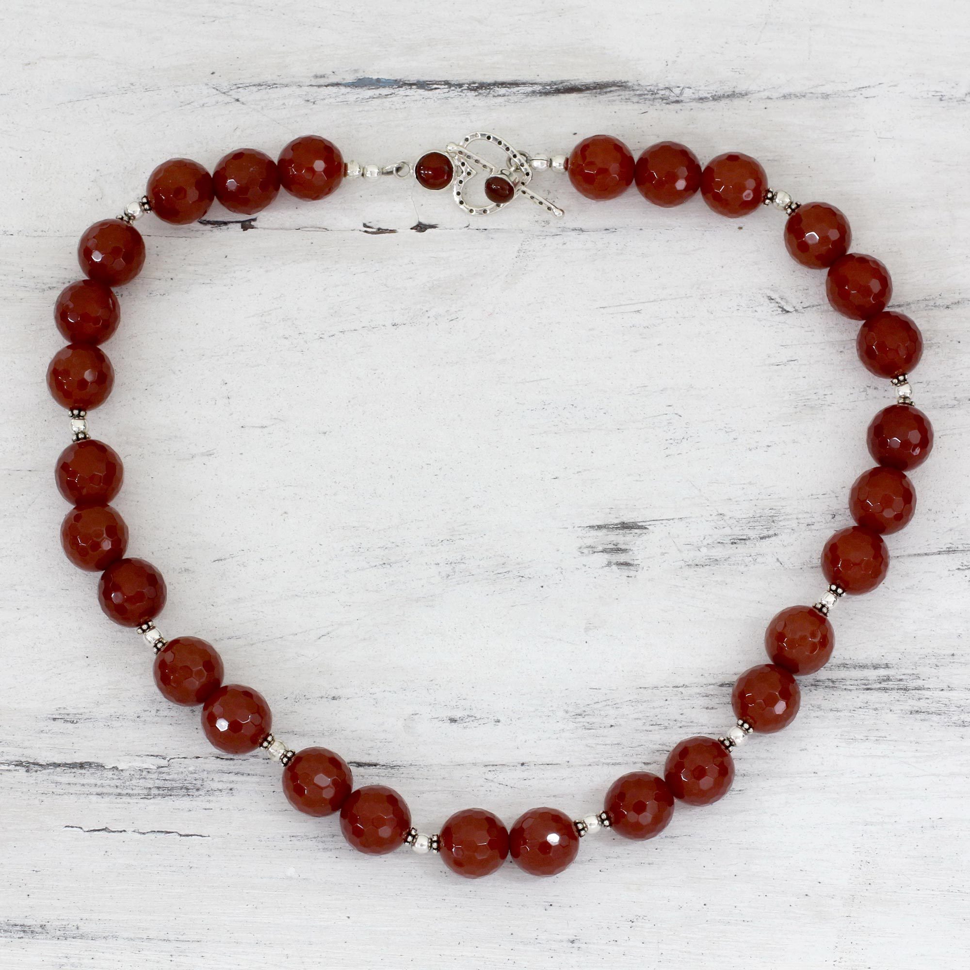 Evoking the fire of passion, faceted carnelian globes alternate with ornate sterling silver beads. Narayannii designs a modern necklace of dramatic elegance. The toggle clasp is shaped like a heart.