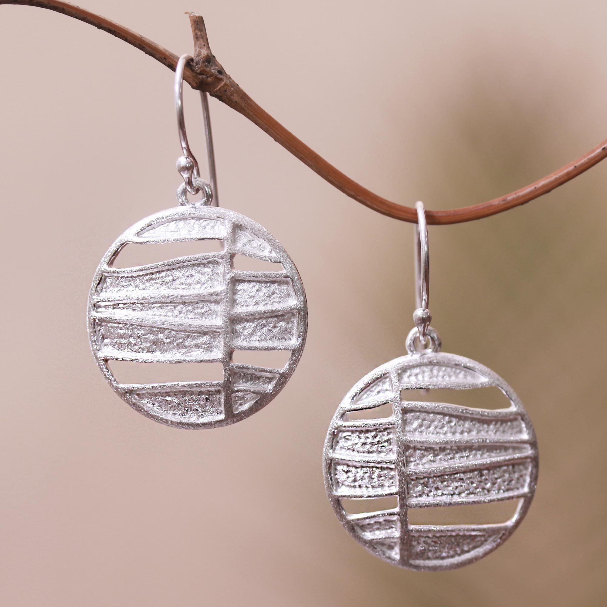 Intriguing and beautiful, these modern dangle earrings are created by Desi Antari in Bali. She crafts these circular earrings from sterling silver, filled with abstract patterns and openwork that is accentuated by a brushed-satin finish.