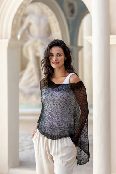 Novica Collection plays with mystery in its newest knit poncho. Made by Balinese artisan, this breezy design combines acrylic and polyamide fibers to create a sheer look that adapts to several styles, adding a layer of seductive enigma thanks to its coal black hue.