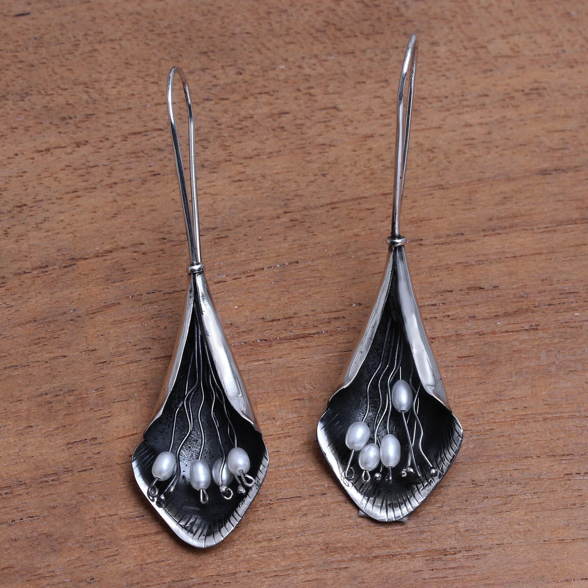Handcrafted from sterling silver, petals caress petite glowing cultured pearls. These modern drop earrings are created by Balinese artisan Nyoman Nartawan. A combination between high-polish and oxidized finishes results in a lovely contrast.