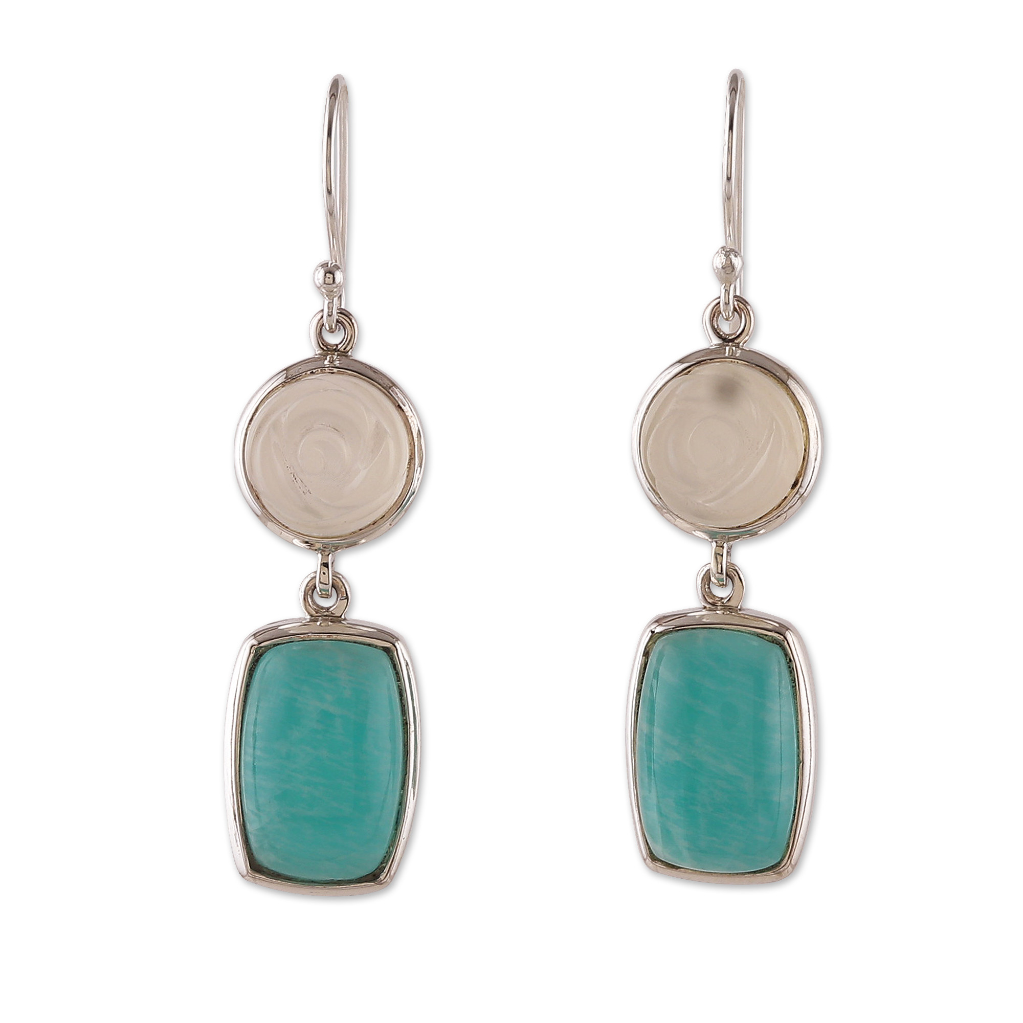 Rich in contrast and alive with light, these remarkable dangle earrings showcase the exquisite beauty of amazonite and agate through a masterful combination of stylish geometric shapes. Radiant sterling silver frames each stone, creating an accessory that reflects Indian designer Shubhra Singh's passion for timeless elegance and contemporary allure.