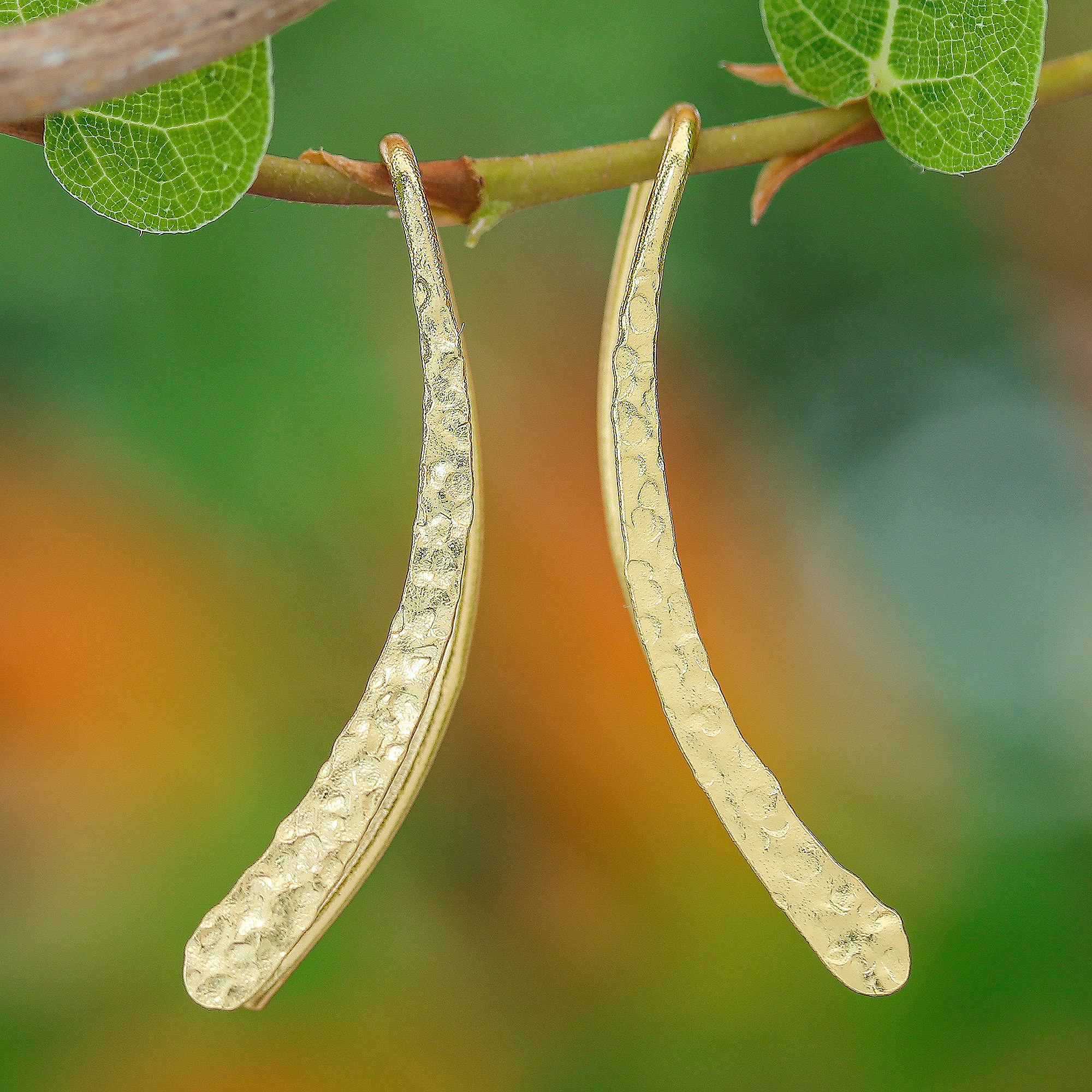 Modern Hammered 18k Gold-Plated Drop Earrings from Thailand, 'Bright Hammered Line'