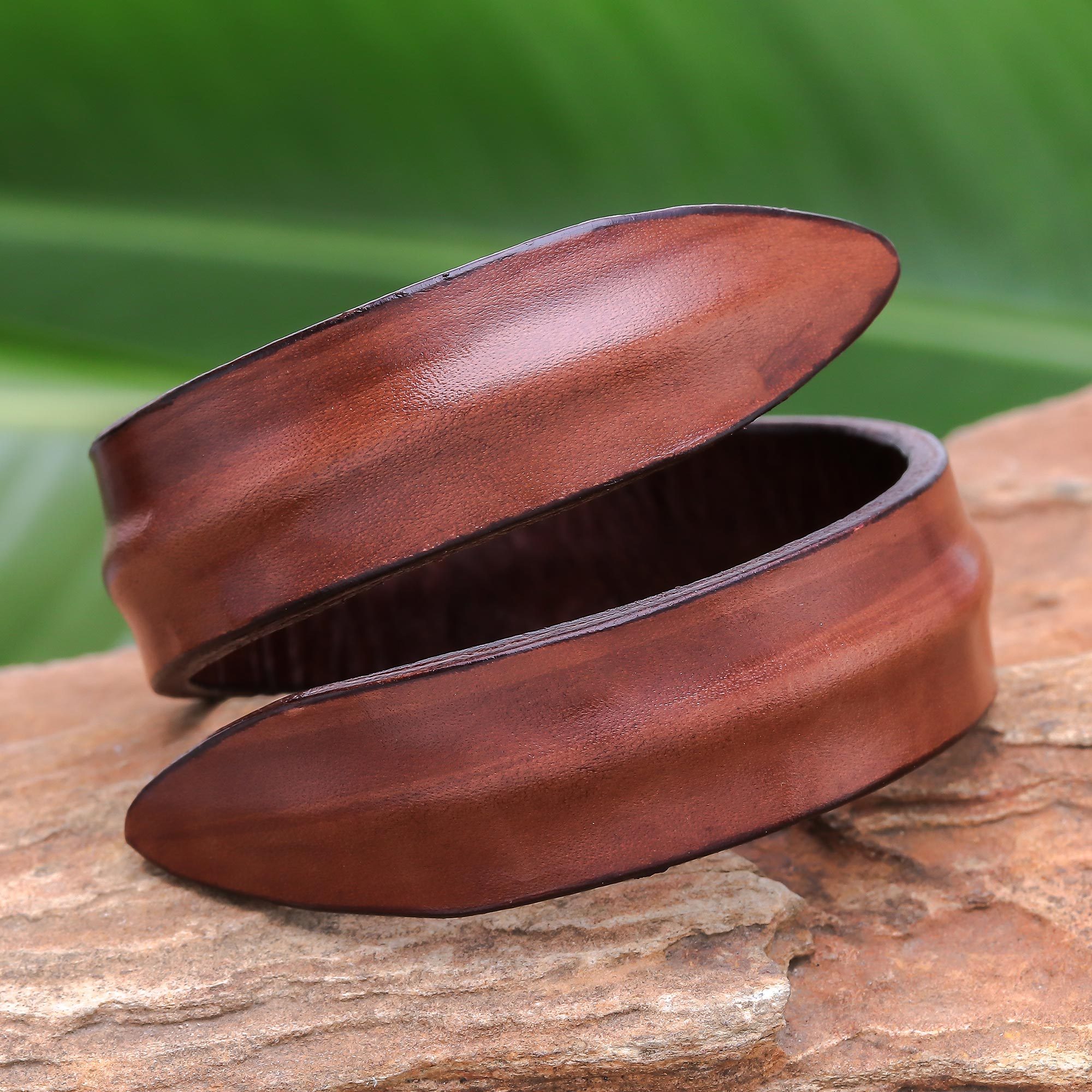 Caressing the wrist with elegance, this wrap bracelet is created by Chang in Thailand. He works with structured leather in a solid brown hue that encircles the wrist.