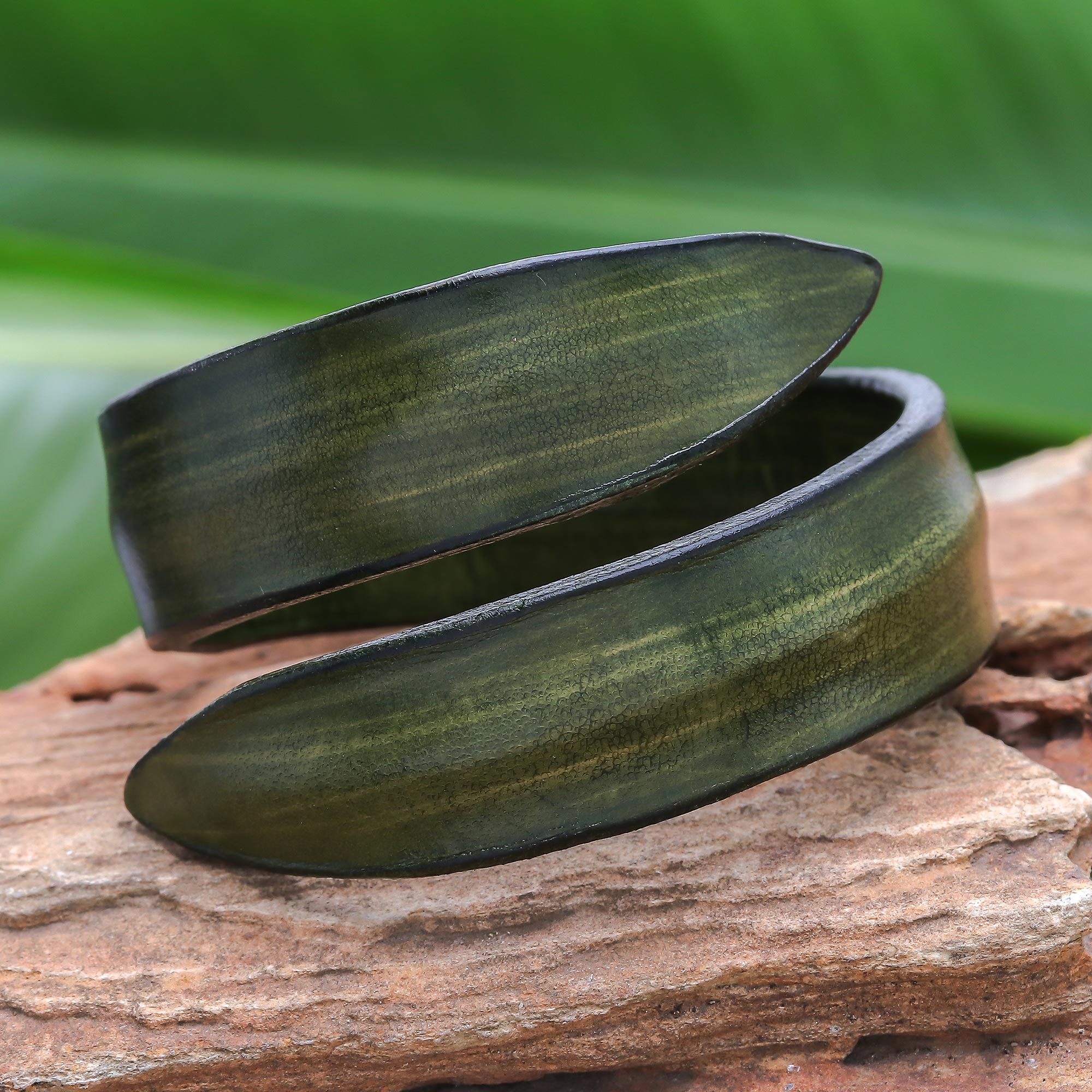 Caressing the wrist with elegance, this wrap bracelet is created by Chang in Thailand. He works with structured leather in a solid green color that encircles the wrist.