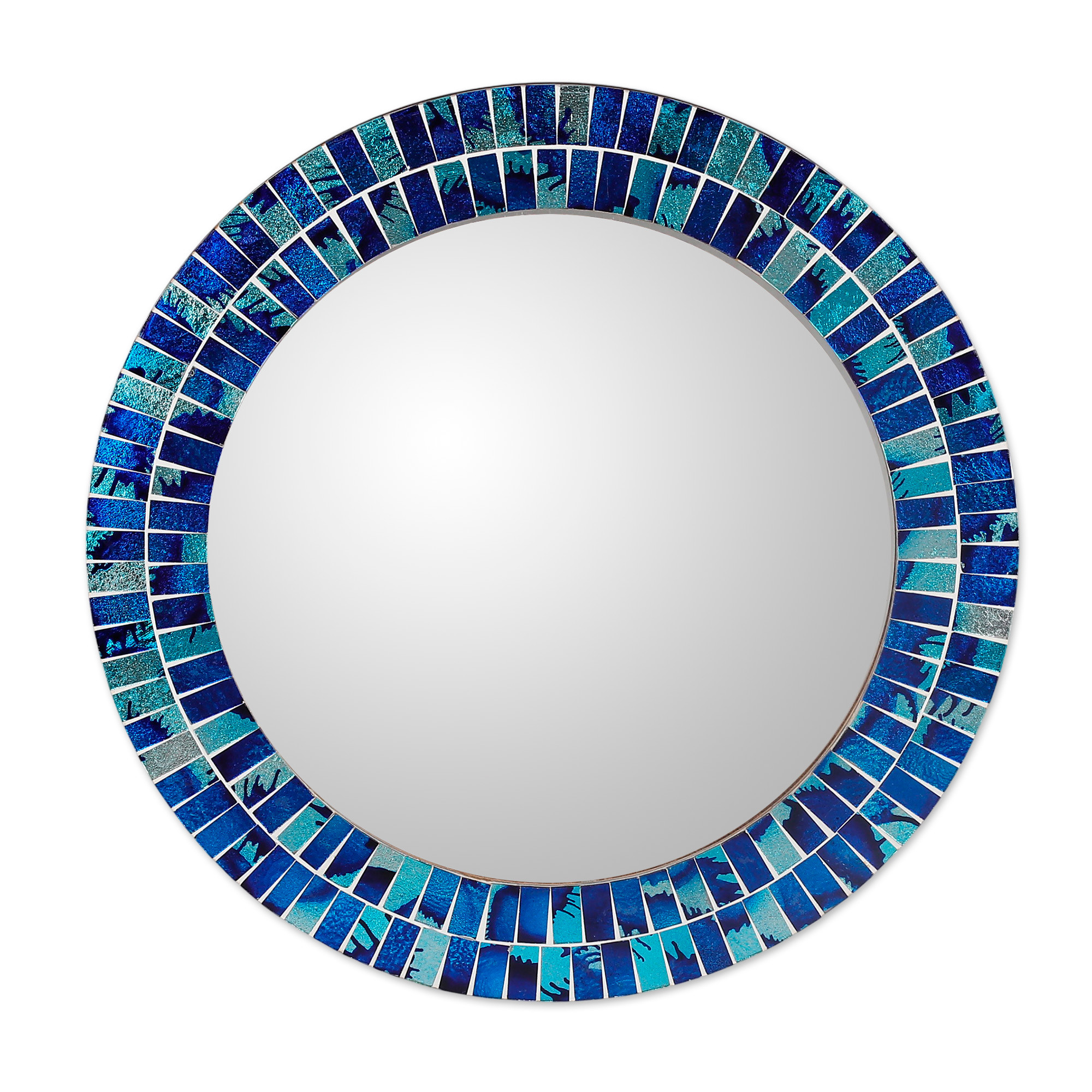 Modern Round Glass Mosaic Wood Wall Mirror in Blue and Aqua, 'Sapphire Beach'