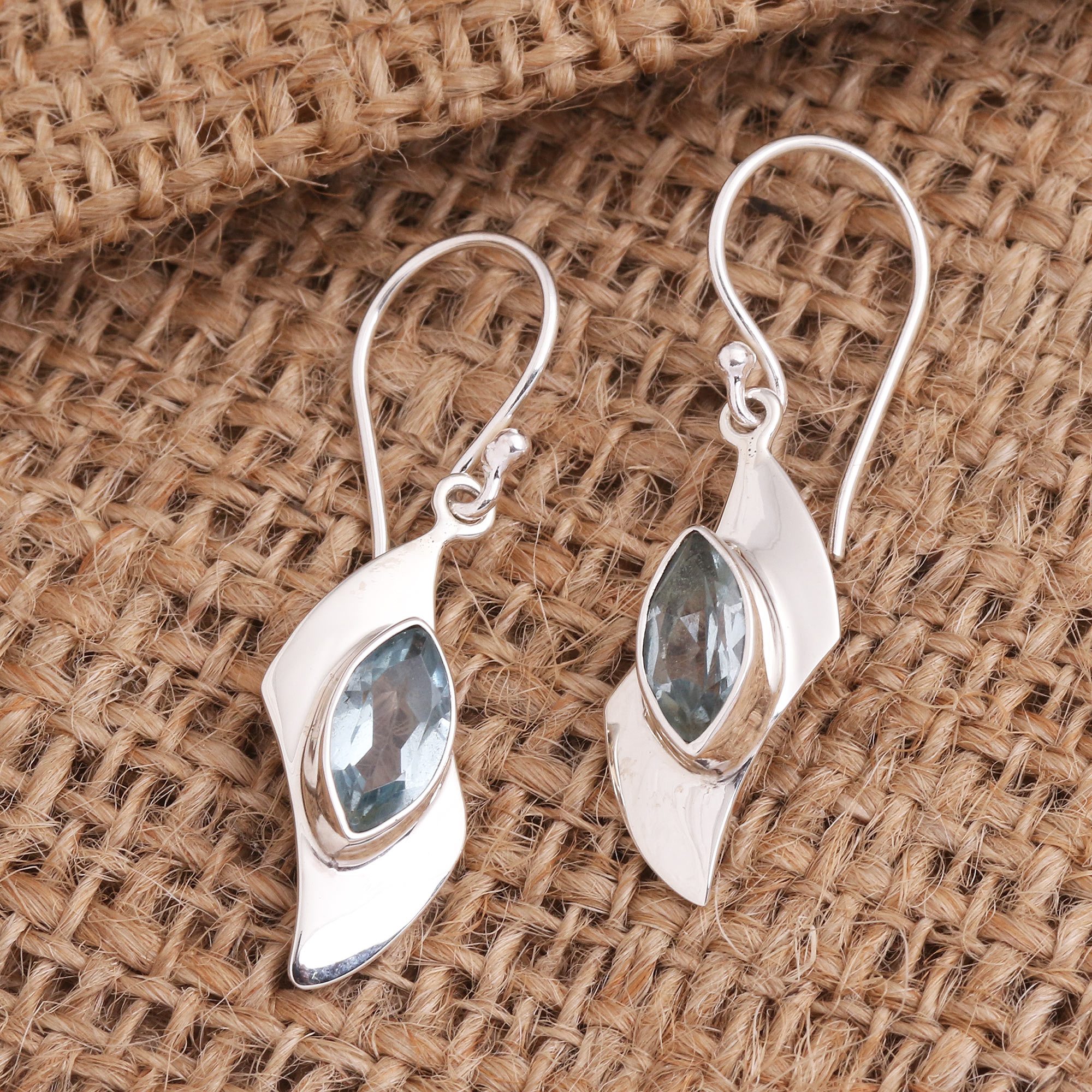 These pretty, contemporary earrings are designed by Ni Wayan Astiti in Bali. The dangle earrings feature sparkling marquise-cut blue topaz on curved rectangles of polished sterling silver.