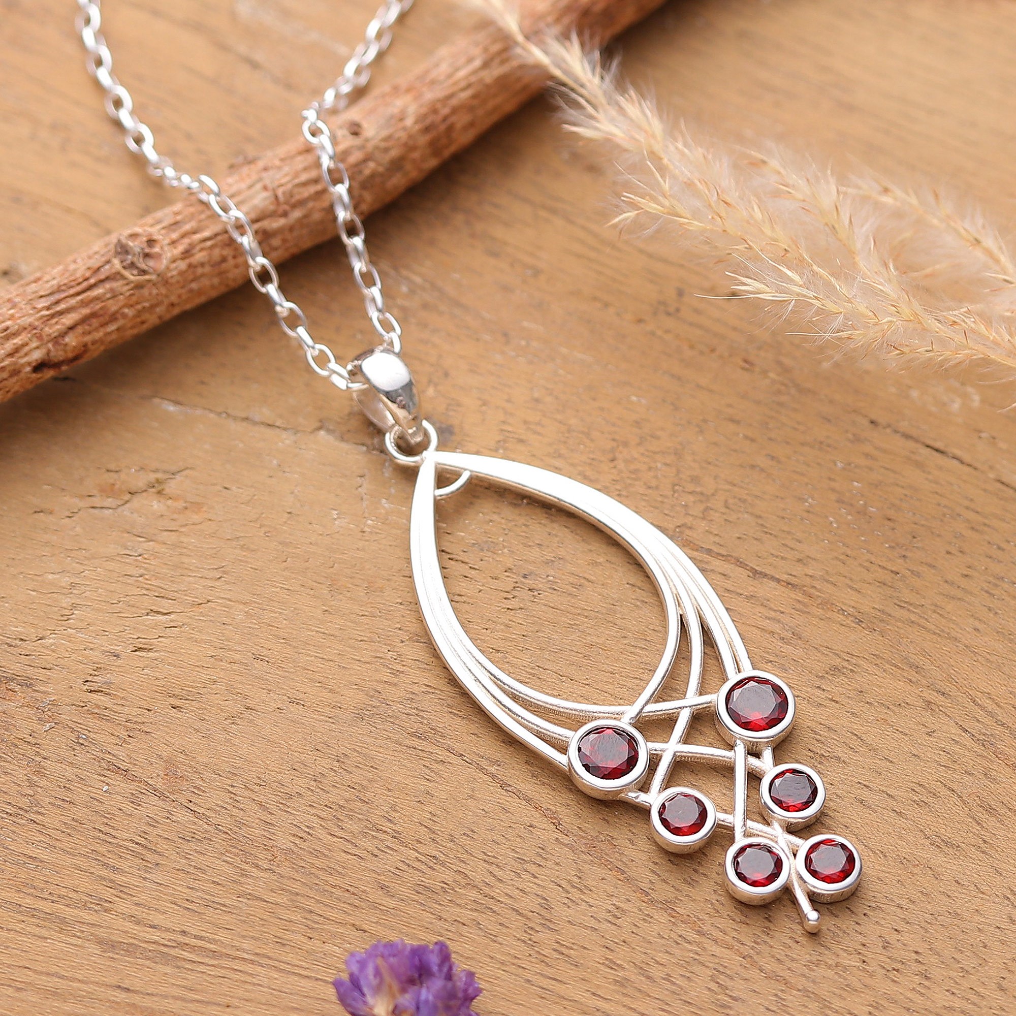 Modern Silver Pendant Necklace with 6 Natural Garnet Gems, 'Crimson Teardrop'