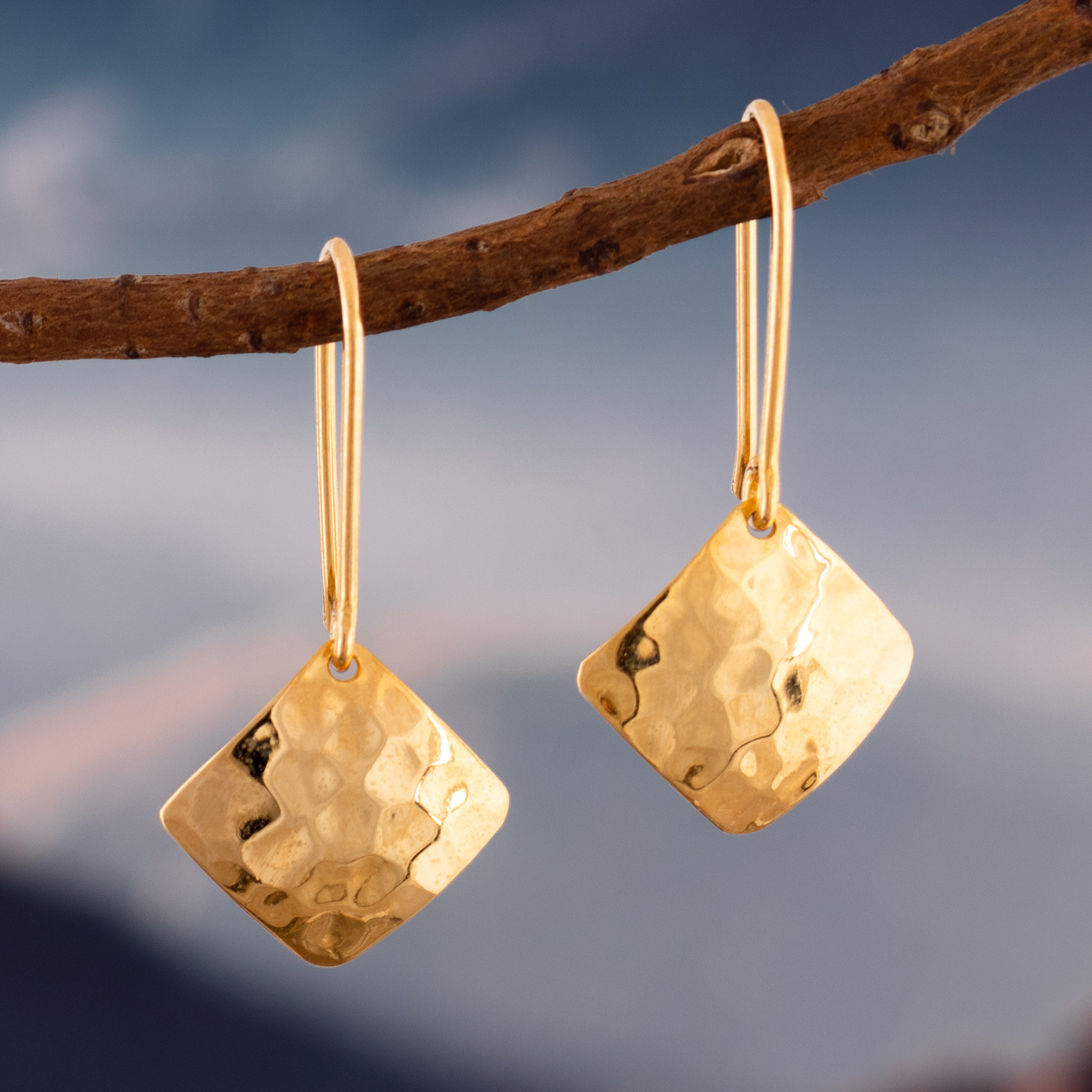 Modern Square 18k Gold-Plated Dangle Earrings from Peru, 'Hammered Gold'