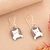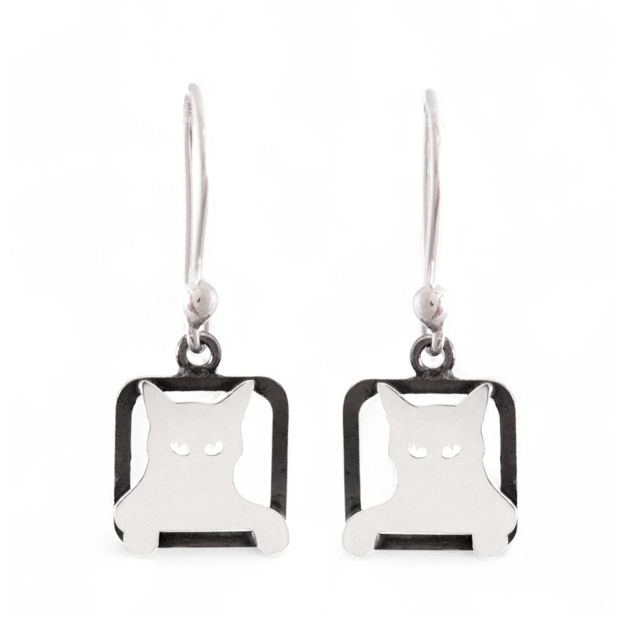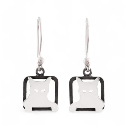 Modern Square Sterling Silver Dangle Earrings of Peeking Cat, 'Mischievous Sparkle'