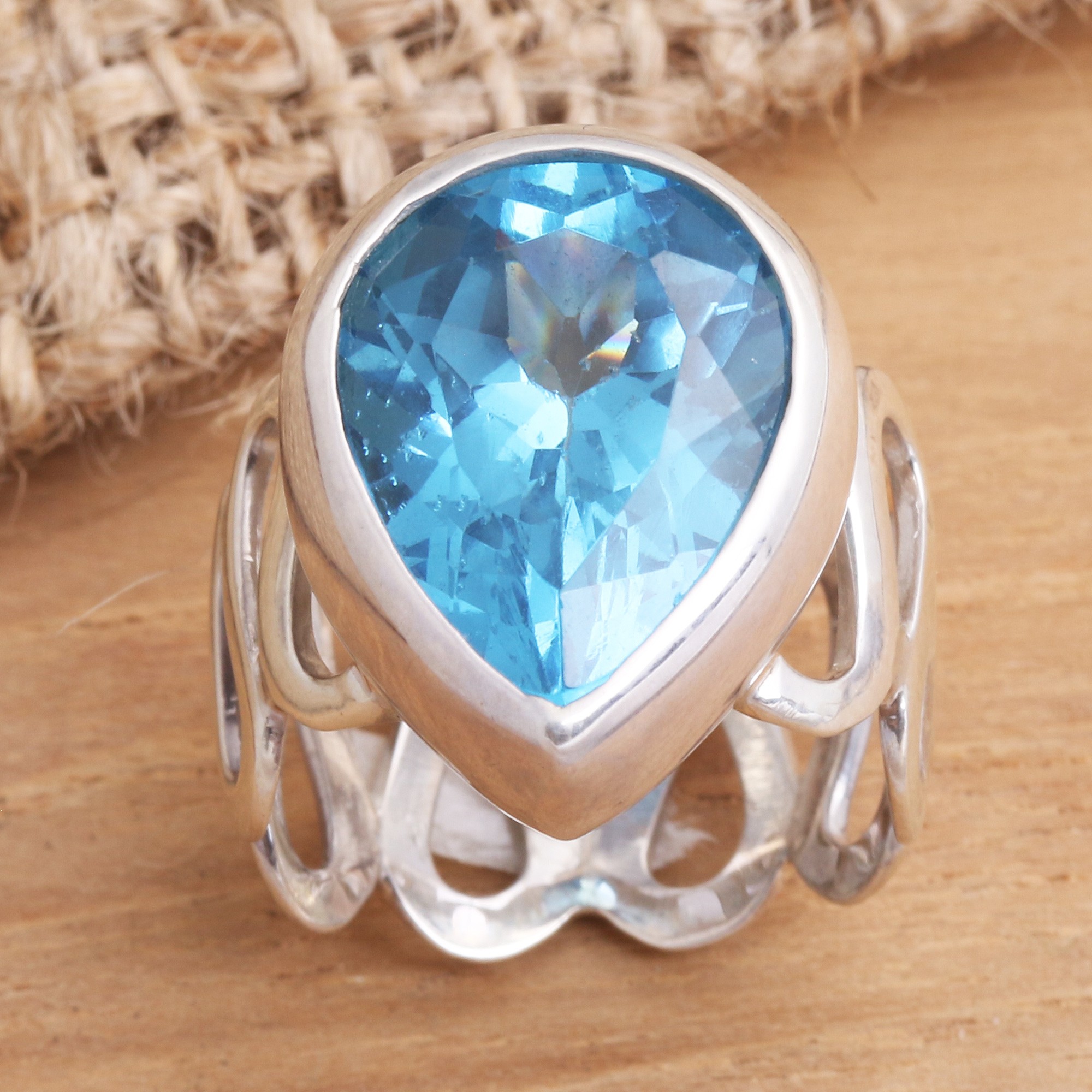 Modern Sterling Silver and Blue Topaz Ring, 'Enchanted Bali'