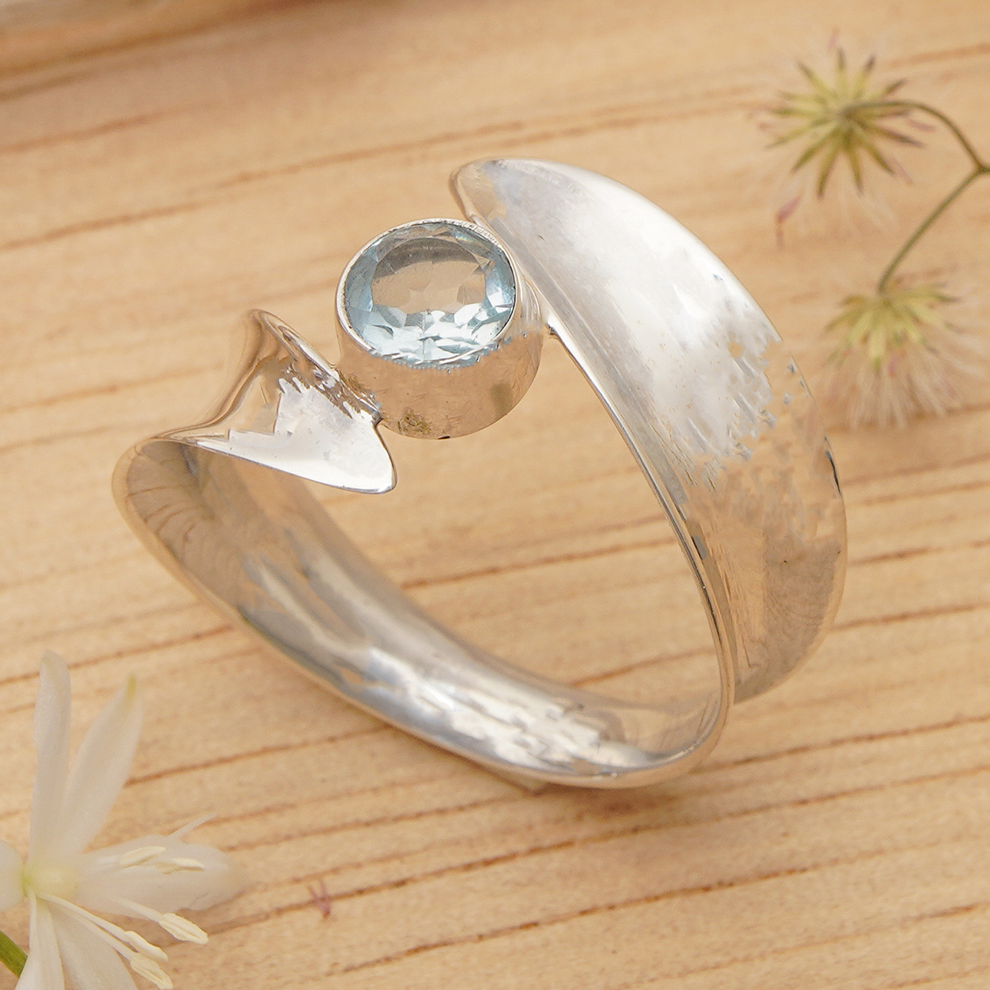 Waves of serene beauty and radiant appearance form this single stone ring by Kadek Aridyah of Bali. The artisan uses sterling silver in a high polish to create this avant-garde piece, crowned with a faceted blue topaz stone as a symbol of loyalty.
