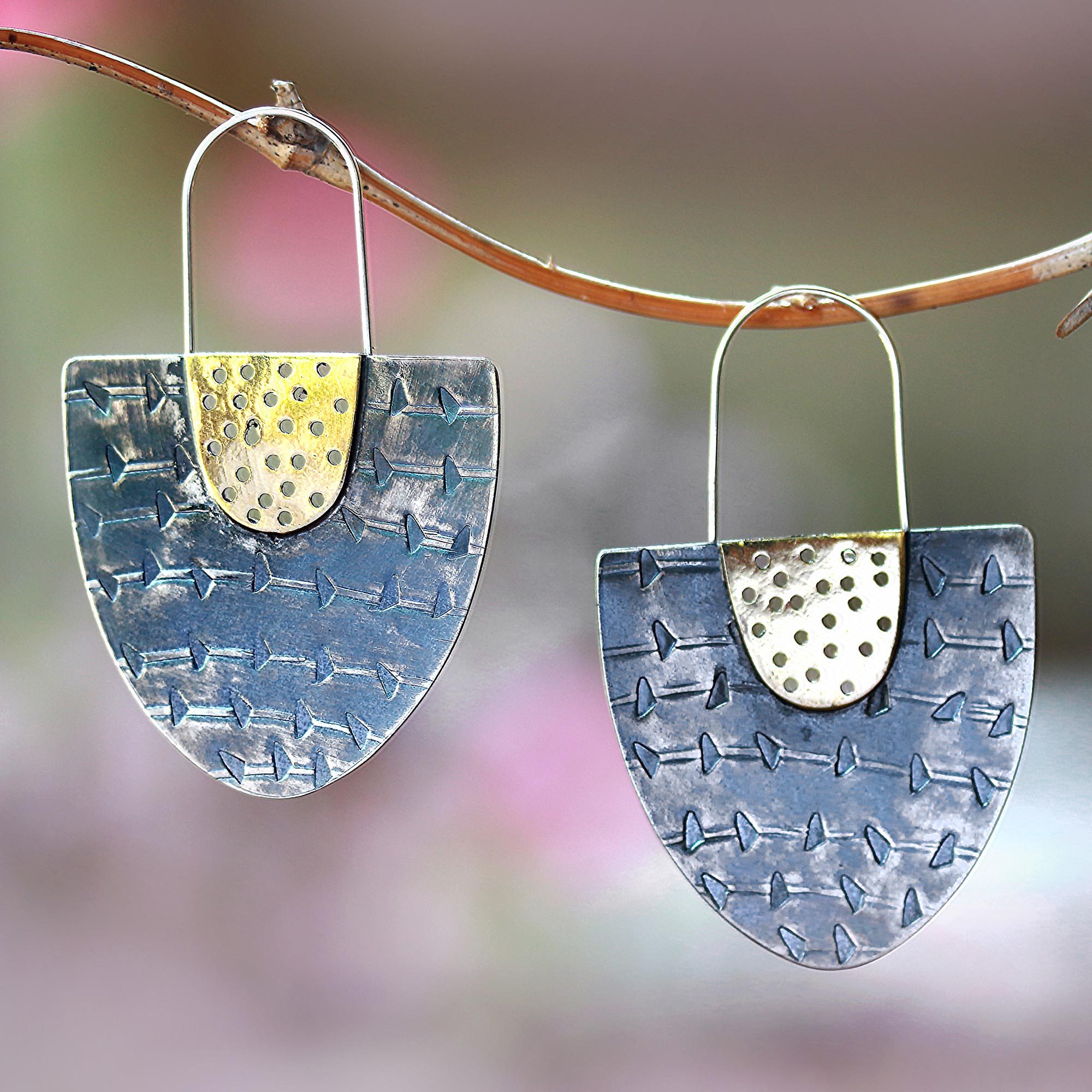 Modern Sterling Silver and Brass Hoop Earrings from Bali, 'Ubud Rainbow'