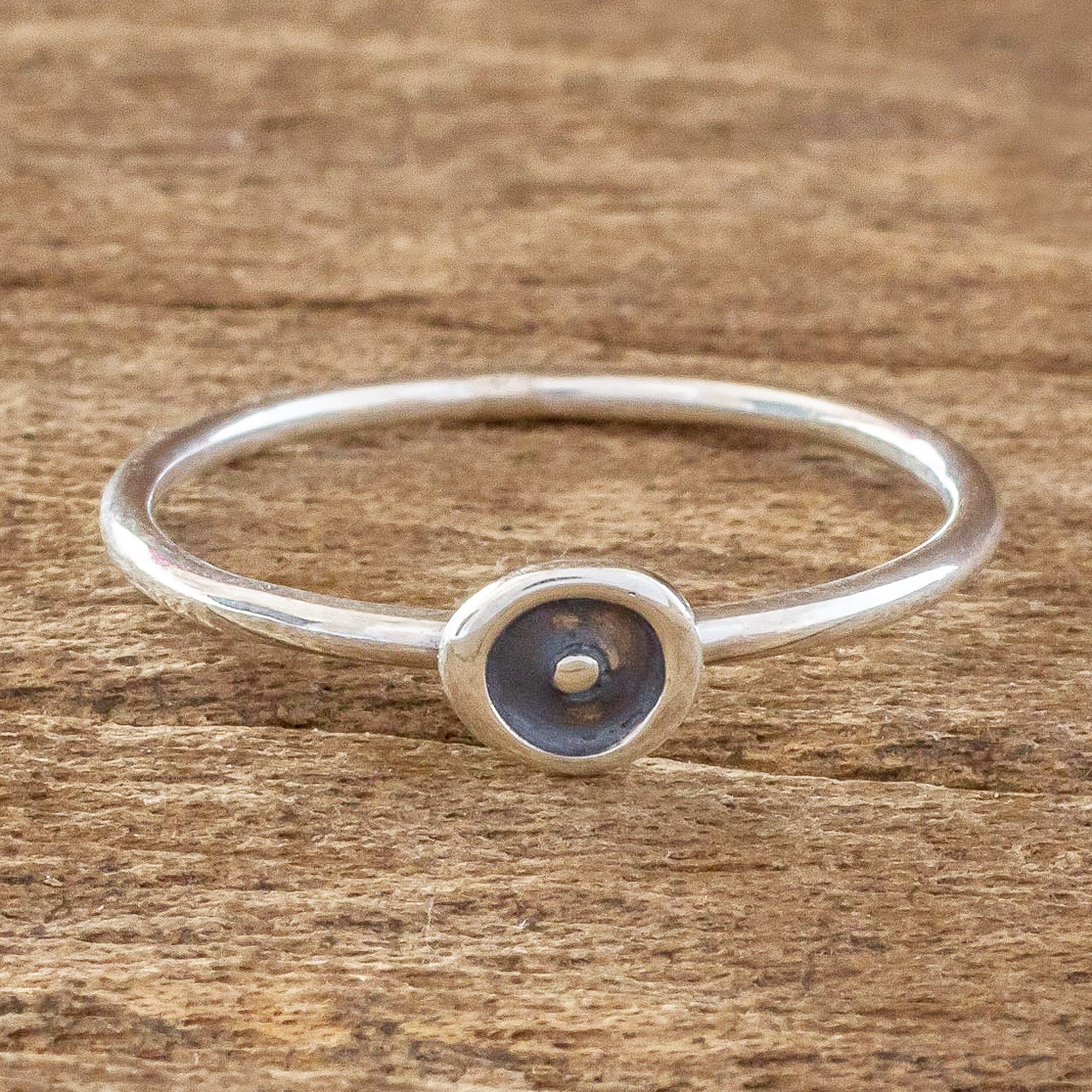 This delicate band ring is designed by Guatemala's Nicte Migliozzi. The artisan crafts the ring from sterling silver to feature a bullseye motif with contrasting polished and oxidized finishes.