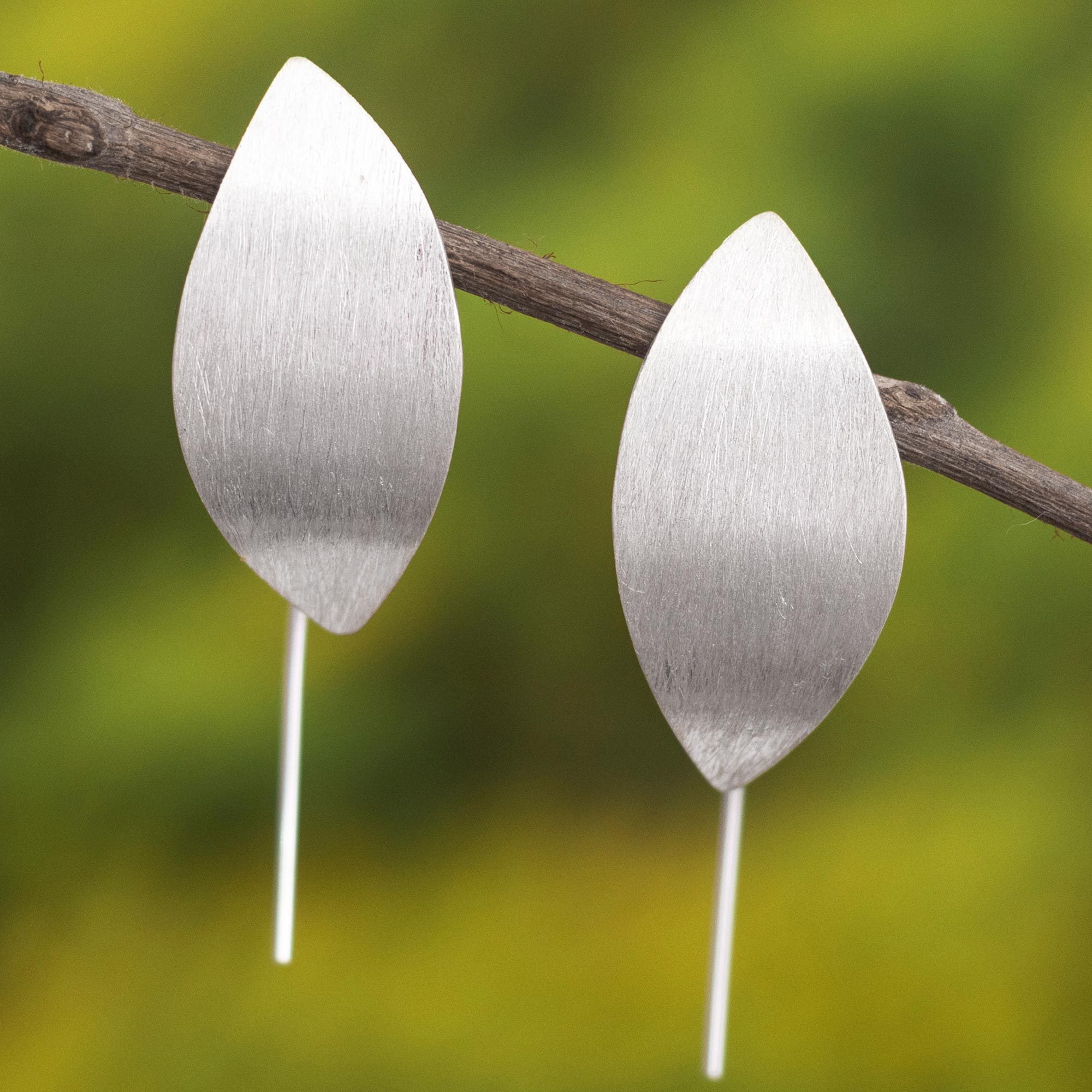 Simple leaves of sterling silver become elegant earrings in the talented hands of Carol Noriega in Peru. She gives the leaves a satiny brushed finish and places them on long, arched hooks.
