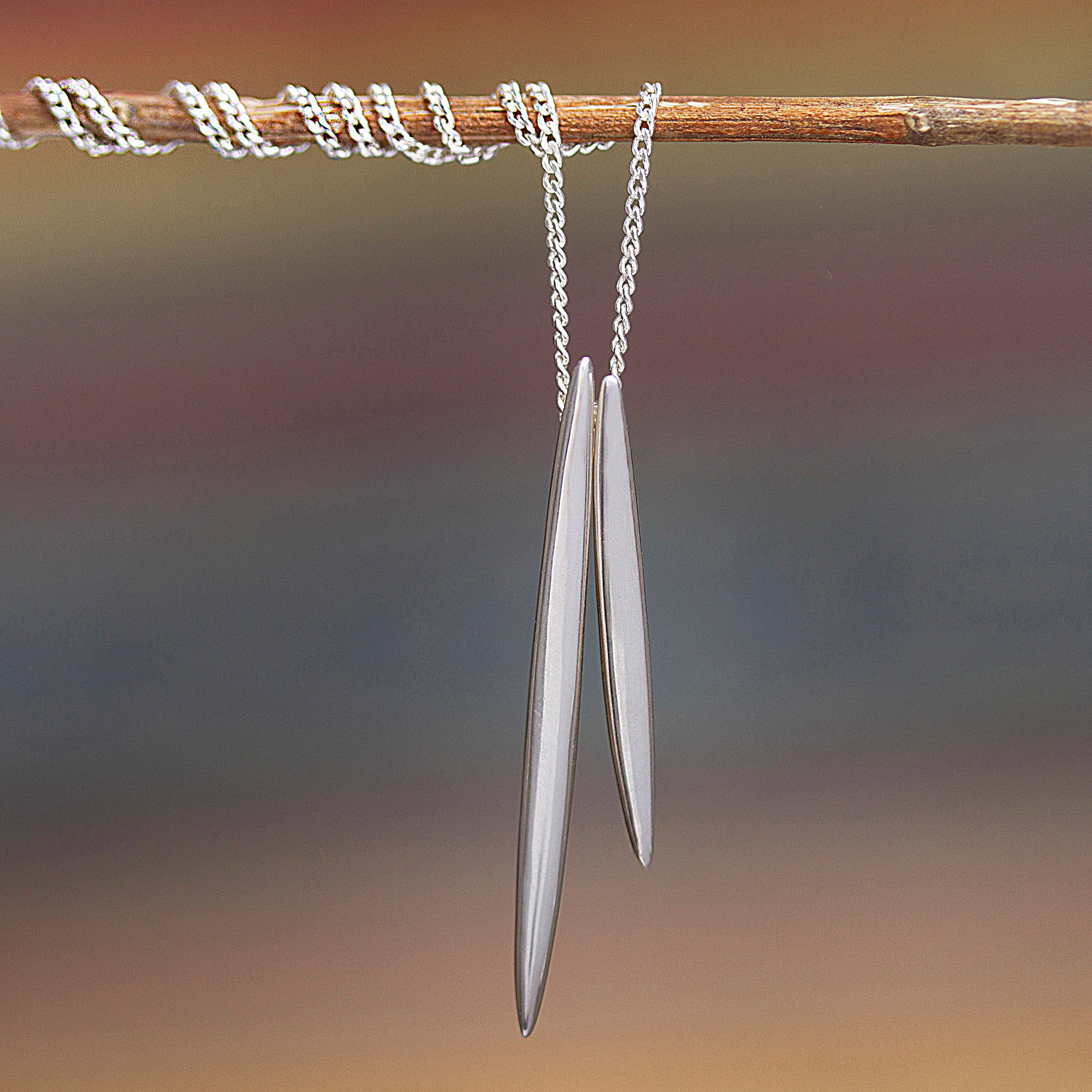 This sleek and minimalist necklace is the original creation of Mexico's Ezequiel Tapia. He works in Taxco sterling silver to create the slender pendants, which center a sterling Cuban link chain.