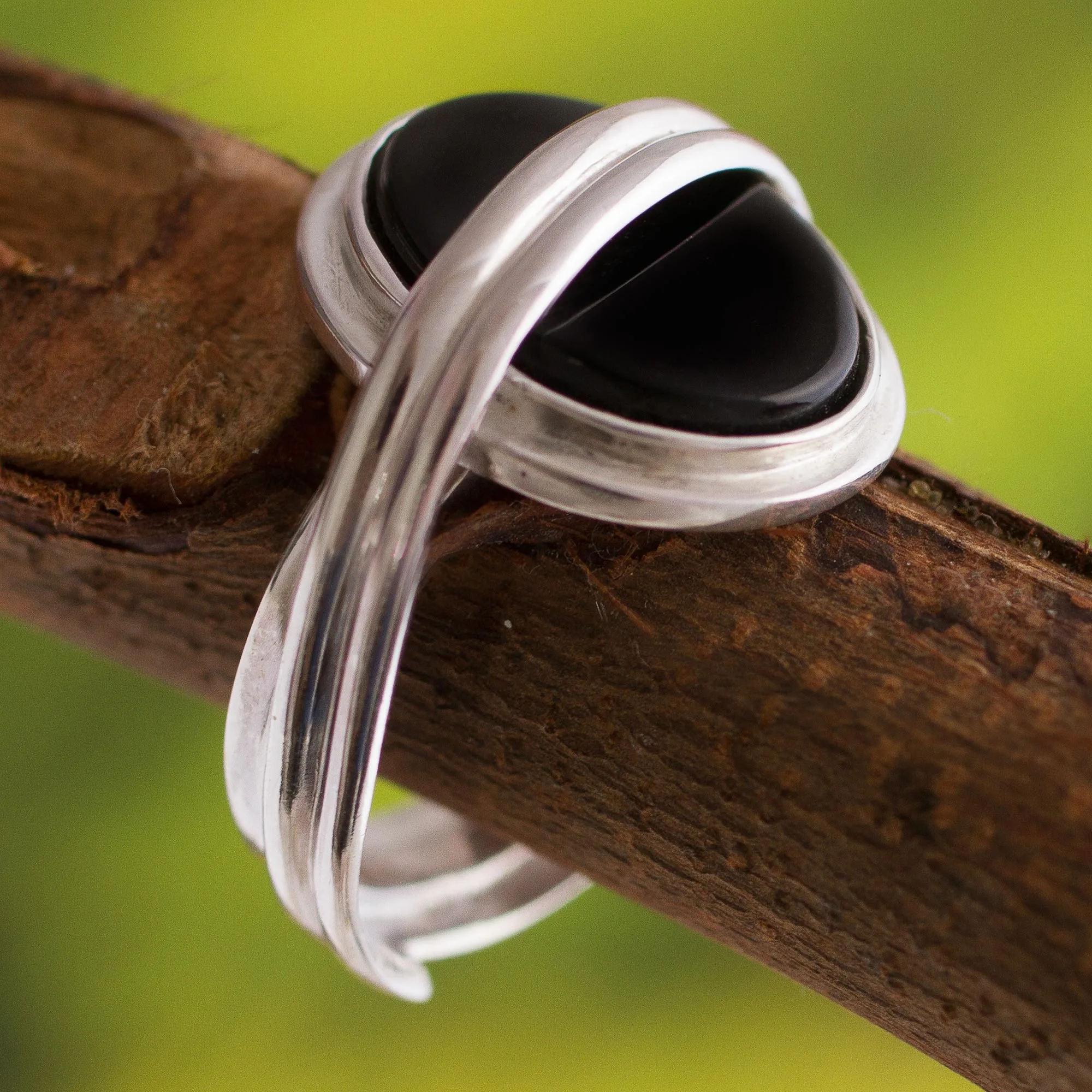 Whirling bands of sterling silver clasp a sleek gemstone in a fervent embrace. By Adriana de Gadea, this boldly modern ring features black onyx.