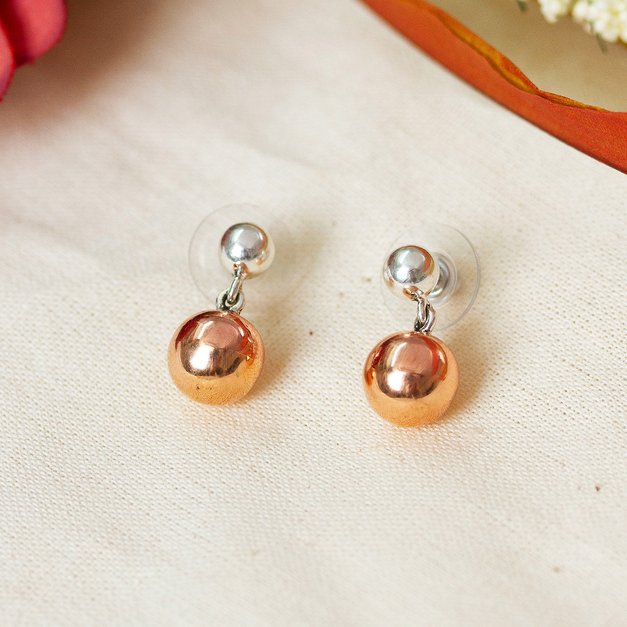 Modern Taxco Silver Dangle Earrings with Petite Copper Orbs, 'Petite Orbs'
