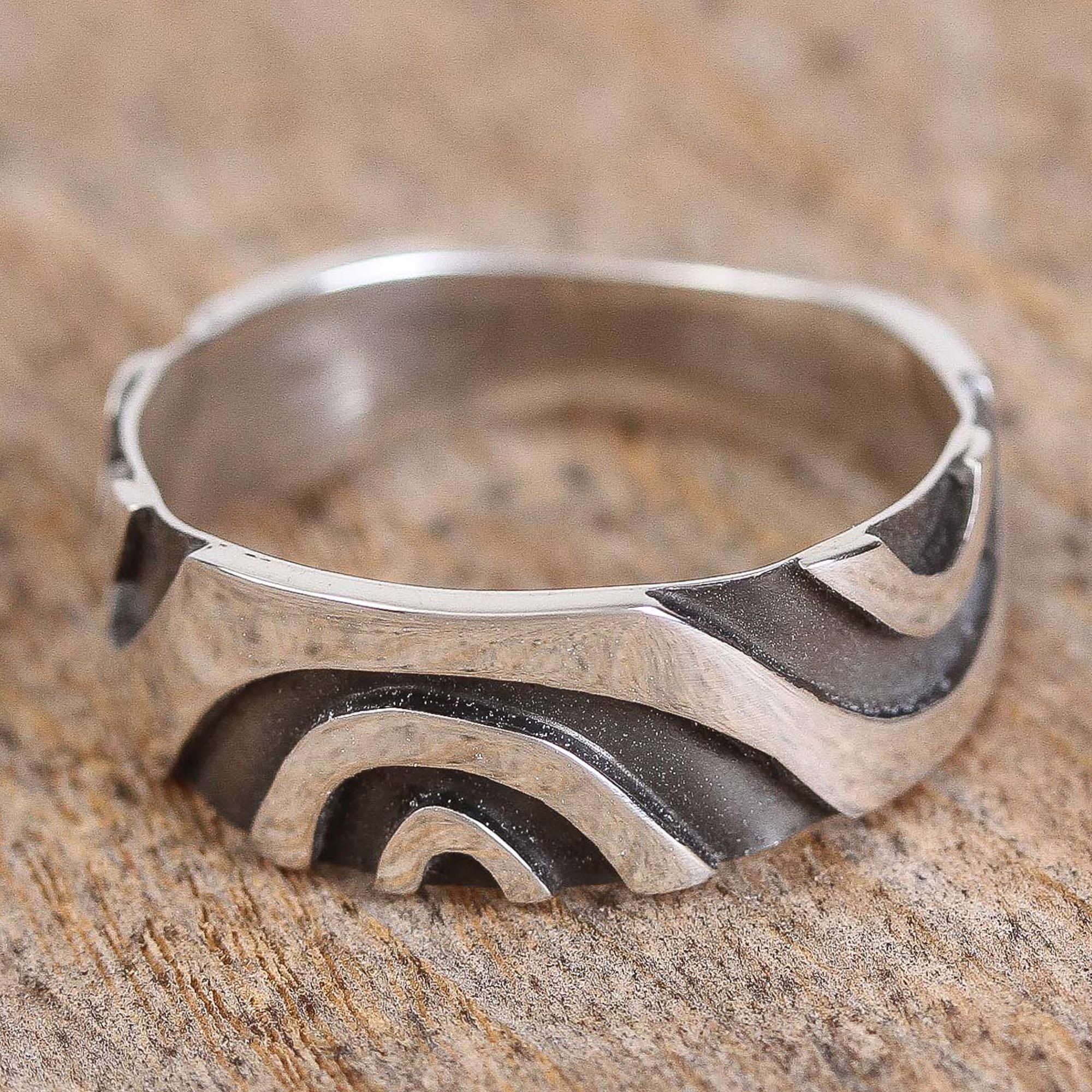 Like the curves of a wavy labyrinth, oxidized patterns decorate this band ring from Mexico. Working in the tradition of Taxco silversmithing, Roy Nilson crafts this modern ring of sterling silver. Says the artisan, "During my life I went through very difficult situations like the death of my second daughter, but here I discovered my spiritual strength and I learned to go ahead following my heart; if you follow what your heart tells you, you will never be mistaken and you will get what you were looking for."