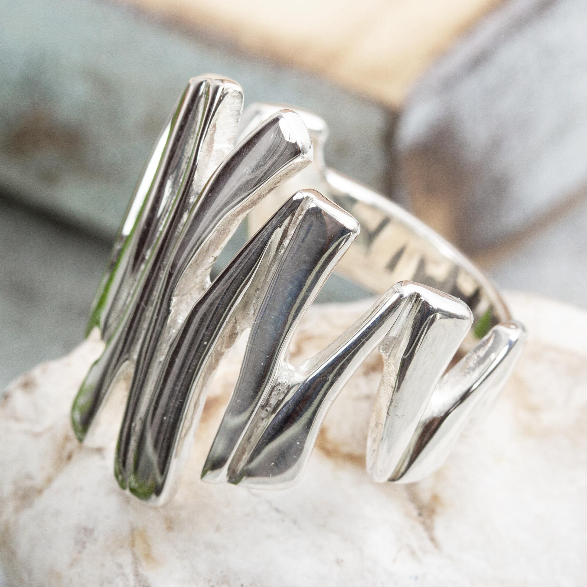 Gleaming with a soulful, high-polish finish, this cocktail ring from Mexico is designed by Oscar Figueroa Escorcia. He works in the tradition of Taxco silversmithing as he crafts the ring, which features modern shapes at its front.