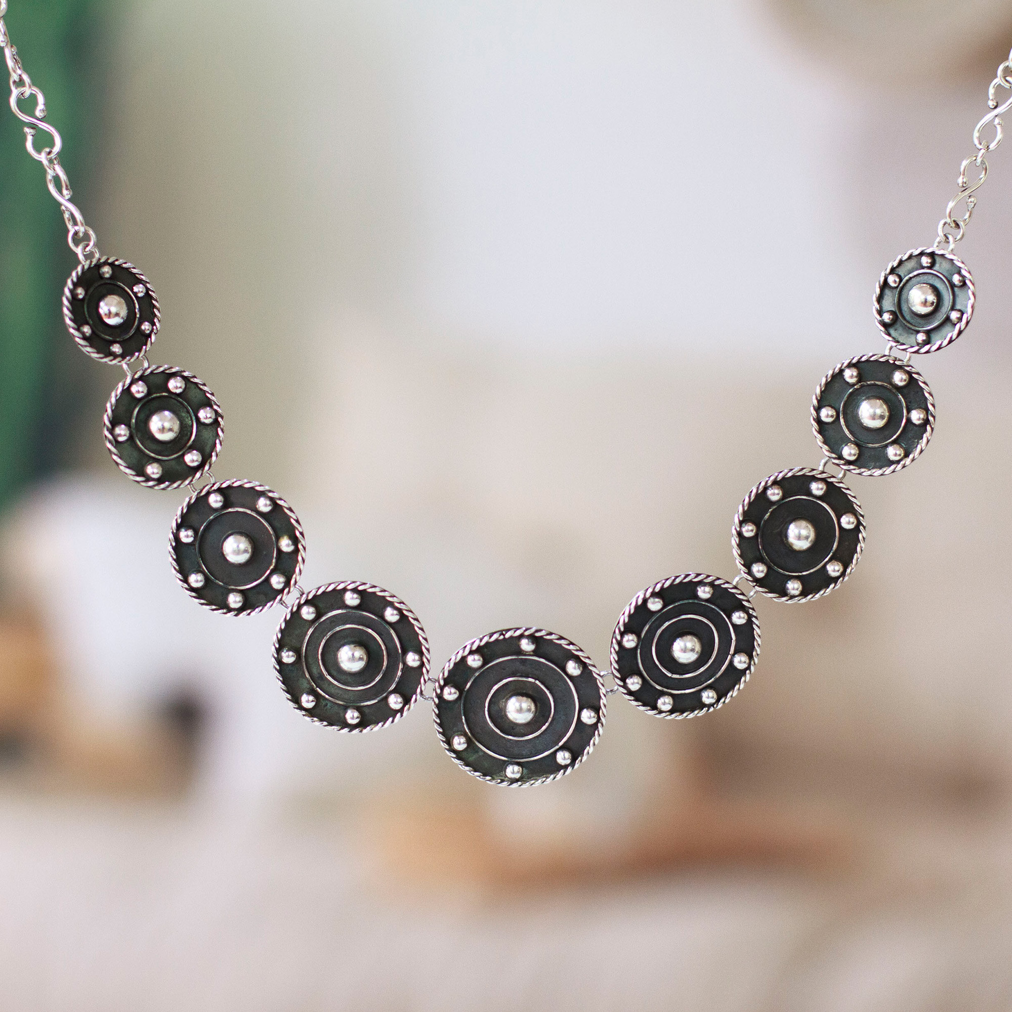 Spin into style with Roy Nilson's exquisite sterling silver link necklace, crafted through time-honored Taxco silversmithing techniques in Mexico. Capturing the hypnotic draw of a wheel's spin, this alluring design entices with its unique interwoven oxidized and polished finishes, granting the piece an unmistakable, one-of-a-kind charm.