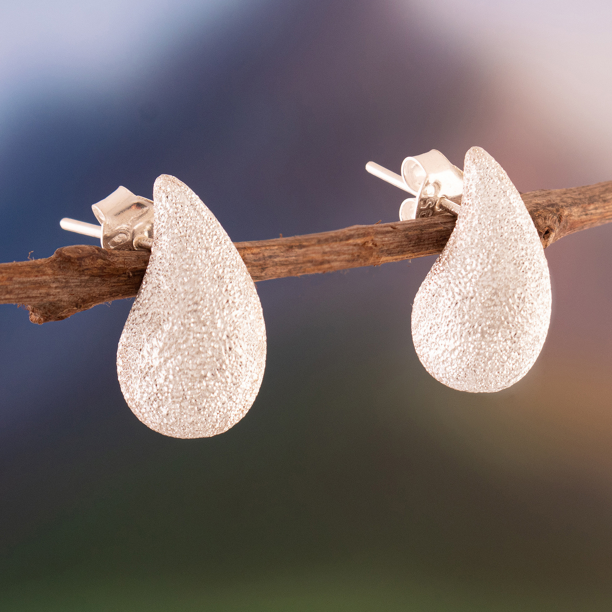 Modern Textured Drop-Shaped Sterling Silver Button Earrings, 'Puissant Tide'