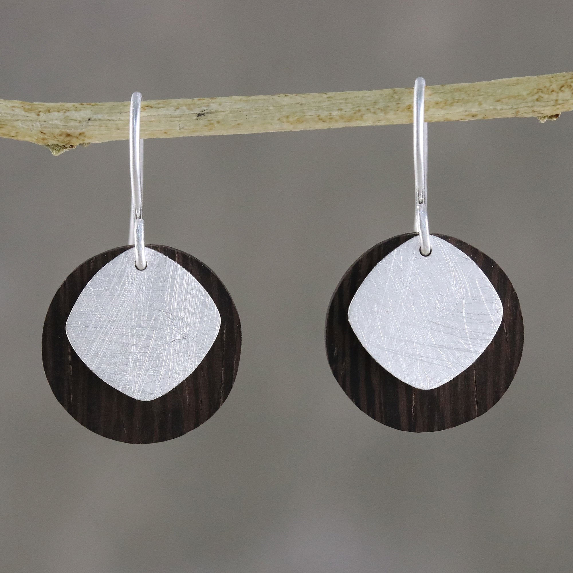 Modern Thai Sterling Silver and Wood Dangle Earrings, 'Simple and Smart'